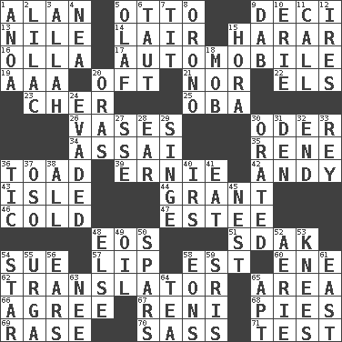 ACROSS 1. Actor Alda or Thicke 5. "Beetle Bailey" pooch 9. Tenth: prefix 13. Mediterranean tributary 14. Den 15. Ethiopian city, capital of Harari 16. Rounded earthenware pot or jar 17. Form of transportation 19. Auto club (abbr.) 20. Often (poetically) 21. Not either 22. Raised railways 23. "Mermaids" star 25. Chief or king in Benin or Nigeria 26. Flower holders 30. River in Europe 34. Slender Brazilian palm 35. French philosopher Descartes 36. Frog relative 39. Bert's buddy 42. "60 Minutes" Commentator Rooney 43. Small island 44. Let have 46. Lacking warmth 47. First name in cosmetics 48. Greek goddess of the dawn 51. Neighbor of Neb. 54. Take to court 57. Mouth edge 58. Eastern Standard Time (abbr.) 60. Compass dir. 62. Interpreter 65. Length times width 66. Match 67. Painter Guido (1575-1642) 68. Sliced desserts 69. Raze (variant) 70. Backtalk 71. Trial DOWN 1. Small Philippine buffalo 2. Pale purple color 3. Assad's deity 4. Teachers' org. 5. Norwegian king 6. Drawn tight 7. Teat (slang) 8. U. of Maine site 9. Pat or tap gently 10. 4th largest of the Great Lakes 11. Give a ring to 12. Angers 15. Israeli folk dance 18. Crowd into 20. Mouths or openings 24. Dodged 27. Compass dir. 28. Ewer handle 29. Burn superficially 30. Declaimed 31. Lair 32. Conclusion 33. Marina Del _, California 36. Nervous spasm 37. Bear (Spanish) 38. Everything 40. Big collection agency 41. Erode 45. Egg locale 48. Otherwise 49. Petroleum 50. Practice fights 52. Nest on high 53. Leg joints 54. Play the lead 55. Capital and largest city of Mongolia 56. Hearing organs 58. Immeasurably long periods of time 59. Indian titles of respect 61. Compass direction 63. Born 64. Afternoon social gathering 65. Fitting