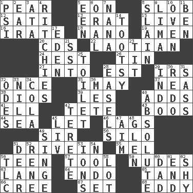 ACROSS 1. Lightbulb-shaped fruit 5. A really long time 8. Messy guy 12. Suttee (variant) 13. Part of Q.E.F. 15. Moving, as bait 16. Feeling or showing extreme anger 18. Billionth: prefix 19. So be it 20. Music discs 22. Of or relating to Laos or its people 24. Command 26. Metal container 27. To the inside or interior of 28. Eastern Standard Time (abbr.) 29. Big collection agency 32. At one time in the past 35. "If ____ say so..." 37. Teachers' org. 38. "Vaya con ____" 39. French article 40. Sums up 41. Pipe bend 42. False hair 43. Expressions of contempt or scorn 44. Ocean 45. Allow 46. Straggles 49. Title for a knight 50. Grain storage tower 51. Popular '50s hangout 55. Cartoonist voice _ Blanc 56. Adolescent 57. Implement 59. Unadorned figures 63. Austrian-born American filmmaker Fritz 64. Inside; within (prefix) 65. Hyperbolic tangent 66. Algonquian 67. Put into a specified state 68. Whirlpool DOWN 1. Air pressure measure (abbr.) 2. Hearing organ 3. "One Day ___ Time" 4. Actors Guy, Robert Welles, and Clint 5. Car or cant ending 6. Of the mouth 7. Nanny 8. Killed 9. Pale green bean 10. Baking chamber 11. Benjamin's nick name 14. Tootsie (variant) 17. Locale of original sin 21. Fast jet (abbr.) 23. Teat (slang) 25. Rest room 28. Artist's stands 29. Southeast Asian peninsula 30. Make new 31. Backtalk 32. Lyric poems 33. The longest river in the world 34. Root beer relative 36. Was introduced to 40. Utter; complete 42. Cigar-shaped 45. 54 in ancient Rome 47. Direct toward a target or goal 48. Small, secluded valley 49. Burn superficially 51. Letter starter 52. French philosopher Descartes 53. Charged atoms 54. Thickened enlargement 56. Affectionate concern, for short 58. Car dealer's back yard 60. Male parent 61. Conclude 62. Like a shrinking violet