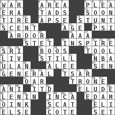 ACROSS 1. Armed conflict 4. Type of rug 8. Entreaty 12. Period 13. Small amounts or degrees 14. Within a short period 15. Become fatigued 17. Domed church section 18. Check the growth or development of 19. Aroma 21. Personal question 23. 23rd letter of the Greek alphabet 24. Zeal 26. American Automobile Association (abbr.) 28. Proofreading order 30. Motivate 34. _ Lanka 37. Expressions of contempt or scorn 39. Instrument 40. 54 in ancient Rome 41. Not moving 43. Basketball assoc. 44. ____ Bator, Mongolia 46. Toward shelter 47. Elected rep. 48. Commissioned military rank 51. Russian ruler of old 54. Boat paddle 55. Heavy duty weighing machine 58. Black tropical American cuckoo 61. It would 63. Evade 65. Soviet premier 1918-24 67. South American Indian 71. Dutch treat 72. Pig sound 73. Go away! 74. Biblical high priest 75. Otherwise 76. ____ d'Azur (French Riviera) 77. Arrange properly for use DOWN 1. Soaks 2. N. Chile seaport 3. More uncommon 4. "One Day ___ Time" 5. Reproach for some lapse or misdeed 6. Begley and Asner 7. Toward the sea 8. Pacific Standard Time (abbr.) 9. Central Nebraska county 10. Immeasurably long periods of time 11. Against 16. Extremities 18. Oceans 20. Small child 22. Separate the seeds from cotton 25. Confederate soldiers (slang) 27. Fitting 29. Add up to 30. Small island 31. Charged atoms 32. Loose flowing garment 33. Flair 34. Strike heavily 35. Cause heat under the collar 36. "Terrible" tsar 38. Petroleum 42. For fear that 45. Modern: prefix 49. Precipitation 50. Tate display 52. "We ___ not amused" (Victoria) 53. Hero or heavy, e.g. 56. Unadorned figures 57. Peak District village in England 58. Medicinal plant 59. Famous astronaut Armstrong 60. Restaurants 62. Plate 64. Give off 66. Mamie's mate 68. Non-commissioned officer (abbr.) 69. Domesticated feline 70. Had dinner