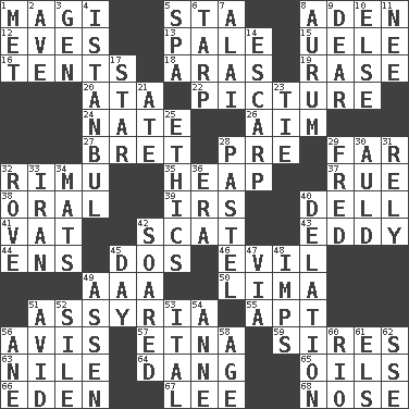 ACROSS 1. Wise men 5. R.R. building 8. Arabian gulf 12. Nights before holidays 13. Diluted with white 15. Ubangi River tributary 16. Portable shelters 18. Caspian sea tributary 19. To erase 20. "One Day ___ Time" 22. Photo 24. Nathan's nickname 26. Direct toward a target or goal 27. Cy Young winner Saberhagen 28. Before (prefix) 29. At a great distance 32. Tall New Zealand timber tree 35. Pile 37. Sorrow 38. Taken by mouth 39. Big collection agency 40. Small valley 41. Large container 42. Leave at once 43. Whirlpool 44. Followers of ems 45. Two (Sp.) 46. Morally bad or wrong 49. Auto club (abbr.) 50. Pale green bean 51. Nineveh was its capital 55. Fitting 56. Deliberation 57. Inactive volcano in Sicily 59. Male parents of animals 63. The longest river in the world 64. Mild oath, euphamism for damn 65. Lubricates 66. Locale of original sin 67. Area sheltered from the wind 68. Characteristic smell of wine DOWN 1. Was introduced to 2. "___ Maria" 3. Commissioned mil. rank 4. Byzantium, centuries later 5. Health resort 6. Canvas cover 7. Mountain range southwest of Kyrgyzstan 8. Gold (Symbol: Au) 9. Letter starter 10. Otherwise 11. Born 14. Fortification 17. Play the lead 21. Had dinner 23. Standoff 25. Principles of right and wrong 28. Soft color 29. Flintstone 30. Old (Scot.) 31. Trust 32. Be footloose 33. SW Asia republic 34. Floor protectors 36. Period 40. Conveyance 42. Flew 45. 24 hours 47. By way of 48. Naughty children 49. NE Netherlands city 51. Enthusiastic 52. Filth; sediment 53. Slanted text style (abbr.) 54. Queen of England 1702-14 56. One (Scot) 58. Grow older 60. River (Sp.) 61. Raised railways 62. Compass dir.