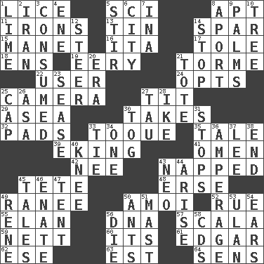 ACROSS 1. Louse (plural) 5. _-fi 8. Fitting 11. Removes the wrinkles 13. Shallow baking pan 14. Coast Guard woman 15. French painter Edouard 16. Call ___ day 17. Lacquered or enameled metalware 18. Followers of ems 19. Suggestive of the supernatural 21. Singer Mel 22. One who uses or employs something 24. Chooses 25. Device for capturing images 27. Teat (slang) 29. At sea 30. Proceeds 32. Writing tablets 33. Woman's close-fitting hat 35. Lie 39. Supplementing with great effort 41. Sign of things to come 42. Born 43. Slept 45. False hair 48. Celtic language 49. The wife of a rajah (variant) 50. Mine, in Marseilles 52. Regret 55. Style 56. Heredity factor (abbr.) 57. Any of the three canals of the cochlea 59. Remaining after all deductions 60. ___ a Wonderful Life 61. _ Allan Poe 62. Compass dir. 63. Eastern Standard Time (abbr.) 64. Elected reps. DOWN 1. Welles in "The Third Man" 2. SW Asia republic 3. Ingested 4. Compass dir. 5. Use a swizzle stick 6. Municipality 7. _ tizzy (2 wds.) 8. To the left, to Queeg 9. Insides of hands 10. Woody plant 12. Navigate 14. Close up, plug up 20. Period 21. Carryall 23. Gospel singer Marvin 25. Head covering 26. White ___ sheet 27. The 19th letter of the Greek alphabet 28. Mamie's husband 30. Coat; cloak 31. Constricts 33. Standoff 34. Single 36. Electrical Measurement 37. Area sheltered from the wind 38. Conclusion 40. Leg joint 43. Modern: prefix 44. Get up 45. Lies 46. Maternal 47. Portable shelter 49. French philosopher Descartes 50. Pismires 51. Vertical spar for supporting sails 53. ____ Bator 54. Hearing organs 56. Pass on 58. Music discs