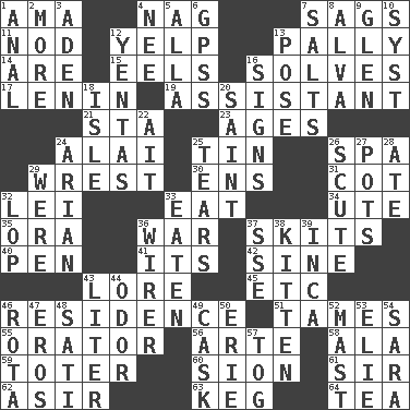 ACROSS 1. Nanny (var.) 4. Tired old horse 7. Droops 11. Lower and raise head in agreement 12. Sharp bark 13. Friendly 14. "We ___ not amused" (Victoria) 15. Snakelike fish 16. Finds the solution 17. Soviet premier 1918-24 19. Helper 21. R.R. building 23. Eras 24. Mountain range southwest of Kyrgyzstan 25. Metal container 26. Health resort 29. Take or capture by force 30. Followers of ems 31. Small bed 32. Luau accessory 33. Ingest 34. Shoshoni 35. Mouth or opening 36. Armed conflict 37. Burlesque acts 40. Animal enclosure 41. ___ a Wonderful Life 42. Trig term 43. Old wives' tales, e.g. 45. And so on (abbr.) 46. Dwelling 51. Softens 55. Speaker 56. Johnson of "Laugh-In" 58. Wing 59. Carrier 60. The Jewish people; Israel 61. Title for a knight 62. SW Saudi Arabia district 63. Cask 64. Afternoon social gathering DOWN 1. Of or related to the anus 2. Greater amount 3. An important port of Yemen 4. Born 5. Silent film actress Nazimova 6. Global Positioning Systems (abbr.) 7. Table seasonings 8. Inventor's middle name 9. Small, secluded valley 10. System (abbr.) 12. Gossips 13. Introduce or present, as a question 16. Attaches a signature 18. Capri or Wright 20. Virtuous person 22. Small island 24. Believer in; advocate of (suffix) 25. Lacerates 26. Snake scale 27. Plant holders 28. Had dinner 29. We are 32. Chop off 33. Ingested 36. One who wires 37. Compass dir. 38. Baby cat 39. South American Indian 43. 61 cubic inches 44. Aroma 46. Roll call or roster of names 47. Greek god of love 48. Suttee (variant) 49. Keg 50. 4th largest of the Great Lakes 52. Vertical spar for supporting sails 53. Writer Wiesel 54. "Two Mules for Sister ____" 57. Coat; cloak