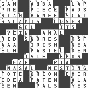 ACROSS 1. Separate the seeds from cotton 4. Swedish rock group 8. Pet locale 11. Before (prefix) 12. Part 14. Groovy apts. 15. Thailand, formerly 17. Indian princess (variant) 18. Get outta here! 19. Deli grouping 21. Failure 23. Set 24. It is 25. Distinctive style or manner 27. Of or related to the anus 30. To free from 31. Sounds asleep 34. Order of Saint Francis (abbr.) 37. American Automobile Association (abbr.) 38. From or relating to Ireland 39. Teachers' org. 40. Shade tree 41. Soft color 43. Lair 44. Small island 45. Greek god of love 47. Hearing organ 49. Parent Teacher Association (abbr.) 50. Rhinal 52. Nestling 56. Lug 57. Constellation of myth 60. Arab leader 61. The main thing one is thinking about 62. Eucharist need 63. Chicken ___ king 64. Car or cant ending 65. Friends 66. Affirmative reply DOWN 1. Global Positioning Systems (abbr.) 2. Roberta Peters solo 3. Anneal 4. Showery time 5. Prejudice 6. Benjamin's nick name 7. Adept person 8. Shoestrings 9. The sixth month of the Jewish calendar 10. Pacific Standard Time (abbr.) 13. Snakelike fish 14. Inconspicuous attention getter 16. Wise men 20. Not women's 22. Petroleum 25. Small bottle 26. Dutch treat 27. Originate 28. A home for chicks 29. American tennis player Robert 30. Actress Charlotte 32. Pinches, bites 33. Taken by mouth 34. Southwest Nigerian state 35. Observes 36. Avid follower 42. Allows 44. Retirement account (abbr.) 46. Assign a rank or rating to 47. Eroded 48. Toward the sea 49. Actor Sean's family 50. Connecting point 51. Trim (branches) 52. Christmas carol 53. "If ____ say so..." 54. "Death on the ____" 55. Pate de foie ____ 56. Make a knot 58. Hit sharply and swiftly 59. Call ___ day