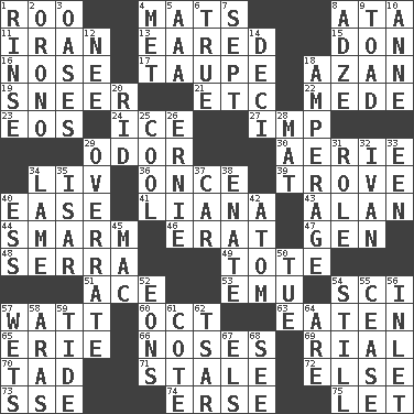 ACROSS 1. Friend of Pooh 4. Floor coverings 8. _ moment's notice (2 wds.) 11. SW Asia republic 13. Having ears or earlike features 15. Spanish title 16. Sense of smell 17. Grayish beige 18. Muslim summons to prayer 19. Scornful expression 21. And so on (abbr.) 22. Ancient Persian 23. Greek goddess of the dawn 24. Frozen water 27. Mischievous child 29. Aroma 30. Nest on high 34. 54 in ancient Rome 36. Single time 39. Collection of objects 40. Comfort 41. Climbing, woody, usually tropical vines 43. Actor Alda or Thicke 44. Excessive but superficial compliments 46. Part of Q.E.F. 47. Commissioned mil. rank 48. Father Junipero _ 49. Haul 51. Adept person 53. Australian flightless bird 54. _-fi 57. Electrical Unit 60. Sep. follower 63. Ingested 65. 4th largest of the Great Lakes 66. Olfactory organs 69. Monetary unit of Yemen 70. Small amount or degree 71. Lacking originality or spontaneity 72. Otherwise 73. Compass dir. 74. Celtic language 75. Allow DOWN 1. Wash lightly 2. U. of Maine site 3. Fertile tracts in a desert 4. Was introduced to 5. American Automobile Association (abbr.) 6. Loyal 7. Back-to-school mo. 8. Axlike tool, used for shaping wood 9. Frog relative 10. Queen of England 1702-14 12. Born 14. Tenth: prefix 18. Electrical Measurement 20. To free from 25. Calm and collected 26. Bert's buddy 28. Floor covering 29. Make much ado about nothing 31. Hero or heavy, e.g. 32. "Terrible" tsar 33. Car or cant ending 34. Unable to walk 35. Austrian river, tributary to the Danube 37. Automobile 38. Maternal 40. Curvy letter 42. Smallest unit of an element 45. Apple computer (short form) 50. Third day of the wk. 52. Immeasurably long periods of time 54. Not moving 55. Desist 56. An arm off of a larger body of water 57. Moistens 58. Caspian sea tributary 59. Event that recurs at intervals 61. ____ d'Azur (French Riviera) 62. Russian ruler of old 64. "We ___ not amused" (Victoria) 67. Raised railways 68. Observe