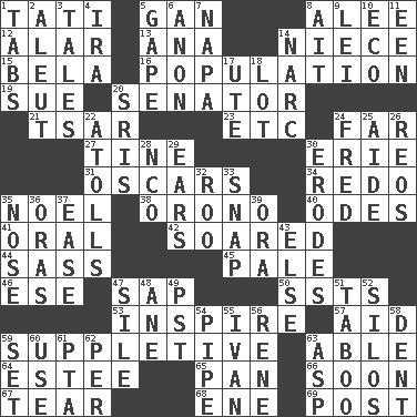 ACROSS 1. Jacques of French films 5. Separate the seeds from cotton 8. Toward shelter 12. Having or resembling wings 13. Santa ___, CA 14. Sibling's daughter 15. Actor Lugosi 16. Census information 19. Institute legal proceedings 20. Elected representative 21. Russian ruler of old 23. And so on (abbr.) 24. Distant 27. Prong on a fork 30. One of the Great Lakes 31. Motion picture awards 34. Do over again 35. Christmas carol 38. U. of Maine site 40. Lyric poems 41. Of the mouth 42. Flew 44. Backtalk 45. Diluted with white 46. Compass dir. 47. Plant excrement 50. Fast planes 53. Motivate 57. Help 59. Supplementary 63. Competent 64. First name in cosmetics 65. Baking dish 66. Within a short period 67. Pull into pieces 68. Compass dir. 69. Mail DOWN 1. Bar bills 2. Native American of Southwest Alaska 3. Stories 4. Retirement account (abbr.) 5. Open wide 6. At once, immediately (arch.) 7. California wine valley 8. Small island 9. Luau accessory 10. Environmental prefix 11. Car or cant ending 14. Drug cop 17. Shoshoni 18. Car dealer's back yard 20. Indian titles of respect 22. Ringlike coral islands and reefs 24. Flintstone 25. Assistant 26. Vintage cars 28. Non-commissioned officer (abbr.) 29. Hearing organs 30. Eats (away) 32. Friend of Pooh 33. Fastener 35. Olfactory organ 36. Mouths or openings 37. Relaxation 39. Mouth or opening 43. Otherwise 47. Filth; sediment 48. A saturated hydrocarbon 49. Pacific Standard Time (abbr.) 51. Off limits 52. Grain storage towers 54. Corncob 55. "Terrible" tsar 56. French philosopher Descartes 58. Gouge 59. Arrange properly for use 60. Purpose 61. Parent Teacher Association (abbr.) 62. For each 63. Cleo's killer