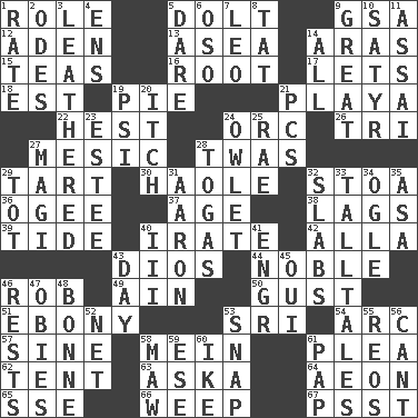 ACROSS 1. Hero or heavy, e.g. 5. Stupid person 9. Girls' org. (abbr.) 12. Arabian gulf 13. Toward the sea 14. Caspian sea tributary 15. Beverages made from leaves 16. Carrot, for example 17. Allows 18. Eastern Standard Time (abbr.) 19. Sliced dessert 21. Beach, in Buenos Aires 22. Behest 24. The grampus (Milton) 26. Three (prefix) 27. Of or pertaining to a meson 28. It was, poetically 29. Small pie 30. White Person, in Hawaii 32. Portico 36. Double curve, resembling the letter S 37. Mature 38. Straggles 39. Periodic rise and fall of the sea level 40. Feeling or showing extreme anger 42. Silent film actress Nazimova 43. "Vaya con ____" 44. Having high moral qualities 46. Director Reiner 49. The 18th letter of the Arabic alphabet 50. Abrupt rush of wind 51. Black 53. _ Lanka 54. Curve 57. Trig term 58. Chow _ 61. Entreaty 62. Portable shelter 63. "____ silly question..." 64. A really long time 65. Compass dir. 66. Shed a tear 67. Inconspicuous attention getter DOWN 1. Pace 2. Lyric poems 3. Resembling or made to resemble leather 4. Followers of ems 5. Have the gumption 6. Bear (Spanish) 7. Lion 8. Make lace 9. Relatively large 10. Letch 11. Slender Brazilian palm 14. 100% 19. 23rd letter of the Greek alphabet 20. Hankering 21. Personal Computers (abbr.) 23. First name in cosmetics 24. A small or young owl 25. Actress Charlotte 27. Wise men 28. Ancient Roman robes 29. Small child 31. Composer Copland 32. Broad, flat, thick pieces 33. Baron Munchausen's specialties 34. Stare at amorously 35. White ___ sheet 40. One more than two 41. Engineer (abbr.) 43. 24 hours 45. Fr. "Yes" 46. Musical pauses 47. Off-Broadway awards 48. Maid-servant 52. Fish or hair follower 53. Fastener 55. Vintage cars 56. Patter 58. Opening into something insatiable 59. Compass dir. 60. D.D.E's nickname 61. Infant food