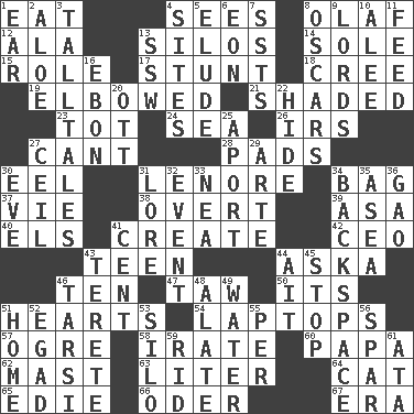 ACROSS 1. Consume 4. Observes 8. Norwegian king 12. According to 13. Grain storage towers 14. Flatfish 15. Hero or heavy, e.g. 17. Difficult or unusual or dangerous feat 18. Algonquian 19. Turned at an angle; bent 21. Cast a shadow over 23. Small child 24. Ocean 26. Big collection agency 27. Patter 28. Writing tablets 30. Snakelike fish 31. Poe poem 34. Paper or plastic container 37. Compete 38. Unconcealed 39. White ___ sheet 40. Raised railways 41. Cause to be 42. Corporate head (abbr.) 43. Adolescent 44. "____ silly question..." 46. Nine, plus one 47. The 23rd letter of the Hebrew alphabet 50. It is 51. Centers of feelings and intuitions 54. Portable computers 57. Legendary monster 58. Feeling or showing extreme anger 60. Dad 62. Vertical spar for supporting sails 63. 61 cubic inches 64. Feline 65. Singer Brickell 66. River in Europe 67. Period DOWN 1. Ewer handle 2. Medicinal plant 3. Baron Munchausen's specialties 4. Settings 5. Dodge 6. Age 7. Fast planes 8. Motion picture awards 9. Nobles 10. Toward shelter 11. Nourish 13. Compass dir. 16. Inky black, to poets 20. Baseball player Mel 22. Flintstone garb 25. To the left, to Queeg 27. To provide with a ceiling 29. Johnson of "Laugh-In" 30. Night before a holiday 31. Old wives' tales, e.g. 32. Happening 33. Teachers' org. 34. Keyboard key 35. At sea 36. E Mali city 41. Penny 43. Cylindrical with tapered ends 44. Small island 45. Cease 46. Tarsus (plural) 48. Having winglike extensions 49. Wetness 51. Residence 52. Mild oath 53. Grain storage tower 55. For each 56. Coast Guard woman 59. To free from 61. _ moment's notice (2 wds.)