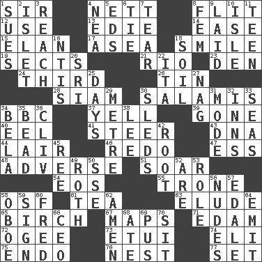 ACROSS 1. Title for a knight 4. Remaining after all deductions 8. Secret move to avoid paying debts 12. Purpose 13. Singer Brickell 14. Comfort 15. Style 17. Toward the sea 18. Grin 19. Religious groups 21. River (Sp.) 23. Lair 24. One of three equal parts 26. Shallow baking pan 28. Thailand, formerly 30. Deli grouping 34. English channel? 37. Shout 39. Went 40. Snakelike fish 41. Guide 43. Heredity factor (abbr.) 44. Den 46. Make new 47. Curvy letter 48. Contrary to your interests or welfare 51. Fly high 54. Greek goddess of the dawn 55. Heavy duty weighing machine 58. Order of Saint Francis (abbr.) 61. Beverage made from leaves 63. Dodge 65. A tree used for making furniture 67. Atlas contents 71. Dutch treat 72. Double curve, resembling the letter S 73. Needle holder 74. Biblical high priest 75. Inside; within (prefix) 76. Egg locale 77. Arrange properly for use DOWN 1. Takes to court 2. Small island 3. Arrive at 4. Teachers' org. 5. Begley and Asner 6. Neckwear 7. Pull apart 8. Opposite of masc. 9. Put down 10. Small island 11. Adolescent 16. Nuclear Threat Initiatives 18. The visible part of the earth's surface 20. Indian title of respect (Mr.) 22. Call ___ day 25. 24-hour periods 27. Tired old horse 29. Distance measurement (Brit.) 30. Bobsleighs 31. Method 32. Lodging establishments 33. Oceans 34. Actor Lugosi 35. Necklace unit 36. 154 in Roman numerals 38. Area sheltered from the wind 42. Carrot, for example 45. To separate or throw off 49. Writer of Portnoy's Complaint (1969) 50. Compass dir. 52. "We ___ not amused" (Victoria) 53. Hero or heavy, e.g. 56. Unclothed pictures 57. Peak District village in England 58. Mitch Miller's instrument 59. Public display of a written message 60. Flintstone 62. So be it 64. Give off 66. Corporate head (abbr.) 68. Had dinner 69. Suppuration 70. Be seated