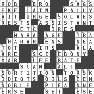 ACROSS 1. Director Reiner 4. Sis' sibling 7. Droops 11. Supplement with great effort 12. (Had) reclined 13. Chummy 14. Small island 15. Goad 16. Finds the solution 17. Musical pauses 19. Aide 21. And so on (abbr.) 23. Angers 24. Hindu Mythology: god of death 25. Grow older 26. Retirement account (abbr.) 29. Ethiopian city, capital of Harari 30. Followers of ems 31. Teachers' org. 32. Small child 33. Big collection agency 34. Chicken ___ king 35. "We ___ not amused" (Victoria) 36. _-fi 37. Black 40. Spoil 41. Area sheltered from the wind 42. Pace 43. Examine minutely or intensely 45. Keyboard modifier key 46. Drawing lots 51. Cod relative 55. Foolish or stupid persons 56. Lubricates 58. Car or cant ending 59. Having high moral qualities 60. Entreaty 61. Compass dir. 62. Celtic language 63. Put into a specified state 64. Compass dir. DOWN 1. Hitchcock's "____ Window" 2. Migrant worker of the '30s 3. Stakes 4. Tavern 5. Port city in Latvia 6. Singles 7. Table seasonings 8. Inventor's middle name 9. Small, secluded valley 10. System (abbr.) 12. A period of five years 13. Airs 16. Fathers 18. Pull into pieces 20. Signals 22. Auto 24. Mother 25. Nest on high 26. Silly 27. Have trust in 28. Auto club (abbr.) 29. Israeli folk dance 32. Scottish cap 33. Ancient Celtic tribe of eastern Britain 36. Narrow boards 37. Epoch 38. Greek mezzo-soprano Agnes 39. "Beetle Bailey" pooch 43. Took without asking 44. Quote 46. Trig term 47. Aroma 48. Teases 49. I made a mistake 50. "Death on the ____" 52. French philosopher Descartes 53. Elected reps. 54. Leg joint 57. Allow