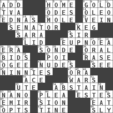 ACROSS 1. Say or write further 4. Dwelling 8. Gilded 12. Federal power corp. 13. Lyric poems 14. Margarine 15. Ferber et al. 18. Undercover agent 19. Distinctive style or manner 20. Elected representative 22. Barrel 23. "Two Mules for Sister ____" 24. Title for a knight 25. Flaplike covering 26. Normal relaxed breathing 30. Period 33. Something which is sent 36. Relating to the mouth 37. Auction offers 39. Luau course 40. Raze (variant) 41. Double curve, resembling the letter S 42. Unclothed pictures 44. Perceive with the eye 45. Fools 47. Mouth or opening 50. Adept person 51. Armed conflicts 53. Shoshoni 54. Refrain by choice 57. Billionth: prefix 59. Entreaty 61. _____ Park, CO 63. Independent ruler or chieftain 64. The Jewish people; Israel 65. Consume 66. Elects 67. Prong on a fork 68. Secret DOWN 1. Had dinner 2. Movie discs 3. Natives or inhabitants of Denmark 4. Same (prefix) 5. Scent 6. Cartoonist voice _ Blanc 7. Compass dir. 8. Head of state? 9. Cassini of fashion 10. Luau accessory 11. Spanish title 16. Of or related to the anus 17. Indian skirt 21. Bits 22. Sleep 24. Institute legal proceedings 26. Singer Brickell 27. Mouths or openings 28. Comfort 29. Toward shelter 30. Inky black, to poets 31. Swiss mountan, "Queen of the Mountains" 32. Arabian gulf 34. Musical composition 35. Dreamland 38. Legislators 42. Born 43. Sty mamas 46. Frozen water 48. Pace 49. Caspian sea tributary 52. Settings 53. A single undivided whole 54. A really long time 55. Object of repulsion 56. Actress Patricia 57. Modern: prefix 58. Electrical Unit 59. Pacific Standard Time (abbr.) 60. Cards in a Roman deck? 62. Filthy place
