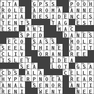 ACROSS 1. Call ___ day 4. Global Positioning Systems (abbr.) 8. "Silly old bear" 12. Hero or heavy, e.g. 14. Scent 16. Singer Murray 17. Capital of Western Samoa 18. Dwellings 20. Portable shelters 22. Label 23. Eastern Standard Time (abbr.) 24. Compass dir. 25. Cuckoo 28. Apple computer (short form) 30. Drove too fast 31. Natives or inhabitants of Denmark 35. Environmental prefix 37. Backtalk 40. Undercover agent 41. Sew up the eyelids of hawks and falcons 42. One or ones belonging to thee 44. Prepare for publication 45. 154 in Roman numerals 46. Northwest Algerian city 47. To sift 48. Small island 50. It may be bright or harebrained 52. Ocean 54. Car dealer's back yard 55. Girls' org. (abbr.) 58. Music discs 61. According to 63. Cell (Danish) 65. Abnormally rapid or deep breathing 70. Tail end 71. Of or related to the anus 72. Sir (Sp.) 73. Against 74. Painter Guido (1575-1642) 75. Left 76. Born DOWN 1. Feeling or showing extreme anger 2. Drinks excessively 3. Place in a line 4. Slender fish 5. Before (prefix) 6. Mayday 7. Stricken, poetically 8. Baking dish 9. At one time in the past 10. Washington bills 11. Behest 13. Erode 15. First man 19. Mild oath 21. Plant excrement 26. A home for chicks 27. Potato state 29. Device for capturing images 30. Finds the solution 32. Connecting point 33. Writer Wiesel 34. Arrange properly for use 35. Snakelike fish 36. To provide with a ceiling 38. Title for a knight 39. Slow-paced one 41. _-fi 43. Inside; within (prefix) 49. Pull apart 51. And so on (abbr.) 53. High mountains 55. American astronaut and politician John 56. Chalkboard 57. Nest on high 58. Burn to charcoal 59. Unit of force 60. Connect, as a bridge 62. Afresh 64. Period 66. Biblical high priest 67. Single 68. Age 69. Nonscientific branch of learning