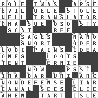 ACROSS 1. Hero or heavy, e.g. 5. It was, poetically 9. Domed church section 13. Tending to cause great harm 14. Ubangi River tributary 15. Took without asking 16. 1994 drama film starring Jodie Foster 17. Interpreter 19. Heredity factor (abbr.) 20. Take to court 21. Bear (Spanish) 22. Filthy place 23. Scram! 25. To separate or throw off 26. Gurus 30. Billionth: prefix 34. Derisive sound 35. Baltic tributary 36. Farming town in central California 39. Aches 42. The content of cognition 43. Washington bills 44. Plunders 46. Portable shelter 47. Bert's buddy 48. Immediately 51. Inconspicuous attention getter 54. Lyricist Gershwin 57. Rowing implement 58. RI univ. 60. Curve 62. Unrelated to defense, as in spending 65. One who doesn't tell the truth 66. Lessep's creation 67. Observes 68. Writer Wiesel 69. So be it 70. Small pie 71. Small island DOWN 1. Tear apart 2. Baking chambers 3. Pale purple color 4. Pipe bend 5. Ballerina skirt 6. Past tense of be (plural) 7. In the manner of 8. Sir (Sp.) 9. "One Day ___ Time" 10. Cooking vessels 11. Groove 12. Suggestive of the supernatural 15. _ gin 18. Compass dir. 20. Comedian Laurel of Laurel & Hardy 24. Aid 27. Republican Party 28. Period 29. Vertical member of a panel or frame 30. Annoying sounds 31. Find the sum of 32. Born 33. Mouth or opening 36. Car dealer's back yard 37. Single 38. Lair 40. Or not 41. Boy, to dad 45. Native american tent (variation) 48. Christmas carol 49. Clumsy lout 50. Take or capture by force 52. Moves on water 53. Hang back 54. South American Indian 55. Wander aimlessly 56. Queen of England 1702-14 58. One who uses or employs something 59. Take ten 61. Algonquian 63. Daniel's nick name 64. Teachers' org. 65. Luau accessory