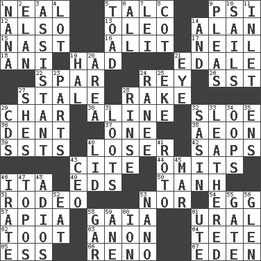 ACROSS 1. Be tempered by heat 5. Baby powder 9. Air pressure measure (abbr.) 12. In addition 13. Margarine 14. ____ Jay Lerner 15. Political cartoonist Thomas 16. Set down 17. Famous astronaut Armstrong 18. Cuckoo 19. Possessed 21. Peak District village in England 22. Coast Guard woman 24. Marina Del _, California 26. Fast jet (abbr.) 27. Showing deterioration from age 28. Libertine 29. Burn to charcoal 30. Place in a line 32. A type of plum 36. Incision 37. Single 38. Age 39. Fast planes 40. Failure 42. Plant excrements 43. Quote 44. Leaves out 46. Call ___ day 49. Begley and Asner 50. Hyperbolic tangent 51. Cowboy competition 53. Or not 54. Ovum 57. Capital of Western Samoa 58. Greek goddess of the earth (variant) 61. Mountain range 62. A blast of a horn 63. Soon (poet.) 64. False hair 65. Double-curved letter 66. Former U.S. Attorney General Janet 67. Locale of original sin DOWN 1. Nanny 2. Enthusiasm 3. Helper 4. Car dealer's back yard 5. Frog relative 6. Everything 7. Luau accessory 8. Small bed 9. Entreaties 10. Moves on water 11. An arm off of a larger body of water 14. Plus 19. Actor Linden 20. Length times width 21. Sight organ 23. Actors' quests 24. The wife of a rajah (variant) 25. Supplement with great effort 27. "______ My Girl" (Turtles hit) 28. Wash lightly 29. Music discs 31. Plunders 32. Indian antelope 33. Tough but pliablecoriaceous 34. I made a mistake 35. Followers of ems 40. Hat (slang) 41. Printing process, for short 43. Corporate head (abbr.) 45. Make imperfect 46. Feeling or showing extreme anger 47. Traditional theme or motif 48. Goodbye (Sp.) 52. Ingest 53. Billionth: prefix 55. Yard entry 56. Small, secluded valley 58. Slender fish 59. A saturated hydrocarbon 60. Electrically charged atom 61. Shoshoni