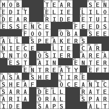 ACROSS 1. Crowd into 4. Pull into pieces 8. Elected rep. 11. Prepare for publication 13. Writer Wiesel 14. _ and Stitch 15. Letter starter 16. Travel on an animal 17. Needle holder 18. Gist 21. Eats 22. Lowest support of a structure 23. Chief or king in Benin or Nigeria 25. Perceive with the eye 26. 100% 29. Orators 32. Sibling's daughter 34. Falsehood 35. 4-wheeled motor vehicle 38. To the inside or interior of 39. Flexible twig of a willow tree 41. Length times width 43. Eastern Standard Time (abbr.) 44. The 18th letter of the Arabic alphabet 45. Keyboard key 46. Plea 50. Newt 51. White ___ sheet 54. A female animal or person 55. Hoop that covers a wheel 57. Archer's quiver 59. Pertaining to the sea 63. "Two Mules for Sister ____" 64. Small valley 67. Assign a rank or rating to 68. Operatic vocal solo 69. Relating to the mouth 70. Coast Guard woman 71. Binary compound 72. Plant excrements 73. Keyboard modifier key DOWN 1. Ancient Persian 2. Lyric poems 3. Prejudice 4. Cigar-shaped 5. Biblical high priest 6. Assist 7. To riddle 8. Locates 9. Dodge 10. Annoying sound 12. Not kosher 14. Area sheltered from the wind 19. Sense of smell 20. Police officer (slang) 21. Distant 23. Migrant worker of the '30s 24. Fermented drink made from hops 26. Cuckoo 27. Actor's bit 28. Allows 30. Place in a line 31. Examine hastily 33. ____ d'Azur (French Riviera) 36. Johnson of "Laugh-In" 37. Coral collection 39. Pledge 40. Beget 42. Tate display 45. Jane of fiction 47. Science/research agcy. 48. Ringlike coral islands and reefs 49. Nervous spasm 51. Slender Brazilian palm 52. Pottery fragment 53. Nest on high 56. Hearing organs 58. Auto club (abbr.) 60. California wine valley 61. Slanted text style (abbr.) 62. Foregone conclusion 64. Two (Sp.) 65. Period 66. Infant locale