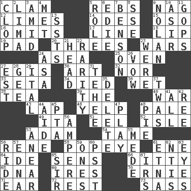 ACROSS 1. Burrowing marine mollusk 5. Confederate soldiers (slang) 9. Tired old horse 12. Citrus fruits 14. Lyric poems 15. Bear (Spanish) 16. Leaves out 17. Actor's bit 18. Mouth edge 19. Writing tablet 20. Threesomes 23. Armed conflicts 24. Toward the sea 25. Baking chamber 27. Armor plate that protects the chest 30. Nonscientific branch of learning 32. Or not 33. Stalk of a moss capsule 34. Passed on 36. Dripping 38. Beverage made from leaves 39. Definite Article 40. Armed conflict 43. Pet locale 46. Sharp bark 48. Diluted with white 49. Call ___ day 51. Snakelike fish 52. Capri or Wight 53. First of billions? 54. Not wild 56. French philosopher Descartes 58. Wimpy's pal 61. Compass dir. 64. Binary compound 65. Elected reps. 66. Short, simple song 68. Heredity factor (abbr.) 69. Angers 70. Bert's buddy 71. Ewer handle 72. Repose 73. Backtalk DOWN 1. Hoof sound 2. Pale green bean 3. Among 4. Was introduced to 5. Hero or heavy, e.g. 6. Singer Brickell 7. Gillaume's butler role 8. Compass dir. 9. Pitcher Ryan 10. SW Saudi Arabia district 11. Republicans 13. Fast planes 21. Froth on beer 22. Noteworthy scarcity 23. Past tense of be (plural) 24. White ___ sheet 26. Solemn pledge 27. Eastern Standard Time (abbr.) 28. Unit of force equal to gravity 29. Slanted text style (abbr.) 31. Giggle 35. Erase 37. It was, poetically 41. 100% 42. To riddle 44. Helper 45. Parent Teacher Association (abbr.) 47. Romp 48. Sliced dessert 50. Electrical Unit 53. Approach 55. Ancient Persian 56. Travel on an animal 57. Pulitzer Prize-winning author Ferber 59. Washington bills 60. Inconspicuous attention getter 61. Inactive volcano in Sicily 62. Nuclear Threat Initiatives 63. Sight organs 65. Title for a knight 67. Big collection agency