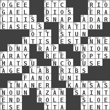 ACROSS 1. Double curve, resembling the letter S 5. And so on (abbr.) 8. _ de Janeiro 11. Highlander 12. "Vaya con ____" 14. Epoch 15. Ms. Damita and namesakes 17. Fastener 18. The sixth month of the Jewish calendar 19. Artist's stands 21. Food allowance for one day 23. Baseball player Mel 25. Surprise greatly 26. Nuclear Threat Initiatives 27. Eastern Standard Time (abbr.) 28. Compass dir. 31. Heredity factor (abbr.) 33. Reproach for some lapse or misdeed 35. The state of being joined or united 37. Like ___ of sunshine 38. To sift 40. Chooses 41. Taiwanese island in East China Sea 43. Non-commissioned officer (abbr.) 45. Purpose 46. Personal question 47. Experiment locale 50. Teases 52. Papal veil 53. Single; one (prefix) 54. Sillier 56. Sunflower state 61. Part of speech 62. Muslim summons to prayer 65. Virtuous person 66. Conclusion 67. Hero or heavy, e.g. 68. A type of plum 69. Compass dir. 70. Call ___ day 71. Portable shelter DOWN 1. Stare 2. Greek goddess of the earth (variant) 3. Snakelike fish 4. Writer Wiesel 5. Begley and Asner 6. Metal container 7. Rough 8. Make new 9. SW Asia republic 10. Rowing implement 13. Arguments over trivial matters 16. Notch 18. The 18th letter of the Arabic alphabet 20. Disorderly outburst 22. Ballerina skirt 24. Russian ruler of old 26. Negative votes 28. Pinches, bites 29. Make mention of 30. Followers of ems 31. To draw with force 32. Nathan's nickname 34. Fenced enclosure 36. Common sense 37. Housemaid (var.) 39. Shade of tan 42. Uhlan (variant) 44. Pig sound 48. Approach 49. Tall, slender dog 51. Prejudice 52. Air blower 54. Charged atoms 55. Naked 57. Political cartoonist Thomas 58. Filth; sediment 59. Soon (poet.) 60. Proofreading order 61. Born 63. The first octave above the treble staff 64. Teachers' org.