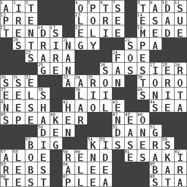 ACROSS 1. Small island 4. Chooses 8. Small amounts or degrees 12. Before (prefix) 13. Old wives' tales, e.g. 14. He sold his birthright 15. Watches over 18. Writer Wiesel 19. Ancient Persian 20. Slender, wiry 22. Health resort 23. "Two Mules for Sister ____" 24. Enemy 25. Commissioned military rank (abbr.) 26. More lively and spirited 30. Compass dir. 33. Composer Copland 36. "Corrida" creature 37. Snakelike fish 39. Cards in a Roman deck? 40. In a ____ (agitated or irritated) 41. Soft 42. White Person, in Hawaii 44. Ocean 45. Orator 47. Modern: prefix 50. Lair 51. Mild oath, euphamism for damn 53. Large 54. Smoochers 57. Medicinal plant 59. Tear apart 61. 1973 Nobel Price Winner (Physics) Leo 63. Confederate soldiers (slang) 64. Toward shelter 65. Tavern 66. Trial 67. Entreaty 68. R.R. building DOWN 1. Fitting 2. Angers 3. Portable shelters 4. Cassini of fashion 5. Much (prefix) 6. Three (prefix) 7. Observe 8. Storms 9. Toward the sea 10. June honoree 11. Institute legal proceedings 16. To trail on the ground 17. Beget 21. Nanny 22. Distress signal 24. Avid follower 26. Earth 27. Charged particles 28. 4th largest of the Great Lakes 29. Roll call or roster of names 30. Elected reps. 31. Ooze 32. Otherwise 34. Having or resembling wings 35. _ de Janeiro 38. Most questionable 42. Layer 43. Conclusions 46. Cask 48. Relaxation 49. Singles 52. Catches 53. Moves up and down 54. Leg joint 55. The content of cognition 56. Three-handed card game 57. Nonscientific branch of learning 58. Area sheltered from the wind 59. Hit sharply and swiftly 60. Pipe bend 62. Retirement account (abbr.)