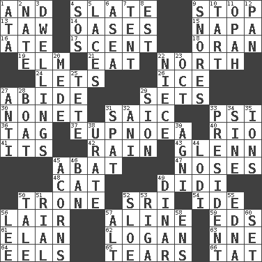 ACROSS 1. Added to 4. Schedule 9. Discontinue 13. The 23rd letter of the Hebrew alphabet 14. Fertile tracts in a desert 15. California wine valley 16. Had dinner 17. Aroma 18. Northwest Algerian city 19. Shade tree 21. Erode 22. 0 degrees 24. Allows 26. Frozen water 27. Remain 29. Arranges properly for use 30. Music written for nine 31. Ketch in the Levant 33. 23rd letter of the Greek alphabet 36. Label 37. Normal relaxed breathing 40. River (Sp.) 41. It is 42. Precipitation 43. American astronaut and politician John 45. Blind as ____ 47. Olfactory organs 48. Feline 49. "You Light Up My Life" star Conn 50. Heavy duty weighing machine 52. _ Lanka 54. Binary compound 56. Den 57. Place in a line 59. Begley and Asner 61. Style 62. Utah city north of Ogden 63. Compass dir. 64. Snakelike fish 65. Pulls apart 66. Make lace DOWN 1. "One Day ___ Time" 2. Nathan's nickname 3. Homes 4. Mayday 5. Shoestrings 6. Toward the sea 7. Portable shelter 8. Eastern Standard Time (abbr.) 9. Sounds asleep 10. Small pie 11. Brightly colored fish 12. Baking dish 20. Ancient Persian 22. Sibling's daughter 23. Sep. follower 25. False hair 27. Opposed to 28. Water vessel 29. The Jewish people; Israel 31. Argument over a trivial matter 32. Cuckoo 33. Elected leader of a country 34. Trig term 35. Charged particles 38. A salt of uric acid 39. Hindu god of fire 44. Farming town in central California 45. Oak nuts 46. Forbid 49. Middle Eastern gold or silver currency 50. Story 51. Monetary unit of Yemen 52. A type of plum 53. Port city in Latvia 55. Pulitzer Prize-winning author Ferber 56. Area sheltered from the wind 57. Keyboard modifier key 58. Followers of ems 60. Arrange properly for use