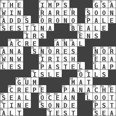 ACROSS 1. Definite Article 4. Naughty children 8. Girls' org. (abbr.) 11. Acquire through effort 12. Less widely known 14. Within a short period 15. Does sums 17. U. of Maine site 18. Light colored 19. French poetic form 21. Memphis, Tenn. Street 23. Big collection agency 24. Followers of ems 25. 1/640 square mile 27. Of or related to the anus 30. Santa ___, CA 31. Sounds asleep 34. And not 37. Compass dir. 38. From or relating to Ireland 39. Period 40. French article 41. Soft color 43. Infant locale 44. Small island 45. Lubricates 47. Chewing product 49. Floor protector 50. Streamer paper 52. Flamboyance 56. Lick closed 57. Sea 60. Spoils 61. Prong on a fork 62. Message 63. Pacific Standard Time (abbr.) 64. The first octave above the treble staff 65. Trial 66. Ocean DOWN 1. It was, poetically 2. Flintstone garb 3. Extremities 4. Removes the wrinkles 5. Hindu Mythology: god of death 6. Adept person 7. Elected rep. 8. Scores awarded for successful feats 9. Not divided or shared with others 10. A saturated hydrocarbon 13. Director Reiner 14. Connect, as a bridge 16. Disorderly outburst 20. Angers 22. Snakelike fish 25. Queen of England 1702-14 26. Crow sounds 27. Ascend 28. A home for chicks 29. American tennis player Robert 30. Leather borer 32. Pinches, bites 33. Of the mouth 34. 1994 drama film starring Jodie Foster 35. Mouths or openings 36. Hit sharply and swiftly 42. Grant temporary use of 44. Mischievous child 46. Slanted text style (abbr.) 47. Let have 48. Ubangi River tributary 49. French painter Edouard 50. To provide with a ceiling 51. Greek goddess of the dawn 52. Writing tablets 53. 911 reaches them 54. Stockings 55. Singer James 56. R.R. building 58. Small bed 59. Compass dir.
