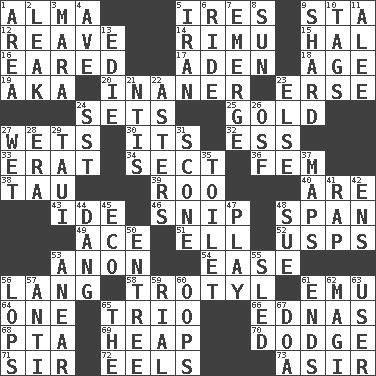 ACROSS 1. _ mater 5. Angers 9. R.R. building 12. Rob, plunder, or pillage 14. Tall New Zealand timber tree 15. Actor Linden 16. Having ears or earlike features 17. Arabian gulf 18. Grow older 19. Alias (abbr.) 20. More empty; more void 23. Celtic language 24. Arranges properly for use 25. Aureate 27. Soaks 30. It is 32. Curvy letter 33. Part of Q.E.F. 34. Religious group 36. Opposite of masc. 38. The 19th letter of the Greek alphabet 39. Friend of Pooh 40. "We ___ not amused" (Victoria) 43. Binary compound 46. Sever or remove by pinching or nipping 48. Connect, as a bridge 49. Adept person 51. Pipe bend 52. United States Postal Service (abbr.) 53. At once, immediately (arch.) 54. Relaxation 56. Austrian-born American filmmaker Fritz 58. Trinitrotoluene 61. Australian flightless bird 64. Single 65. Musical group of three 66. Ferber et al. 68. Parent Teacher Assoc. 69. Pile 70. Evade 71. Title for a knight 72. Snakelike fish 73. SW Saudi Arabia district DOWN 1. Type of rug 2. Path through which fluid escapes 3. Hindu Mythology: god of death 4. "___ Maria" 5. SW Asia republic 6. Travel on or in a vehicle 7. Develop 8. Player for Phoenix 9. Broken piece 10. Labels 11. Toward shelter 13. Singer Brickell 21. Nuclear Threat Initiatives 22. Michaelmas daisies 23. Otherwise 24. Fast jet (abbr.) 26. Order of Saint Francis (abbr.) 27. Dripping 28. Period 29. "Change" in Tahitian 31. Biscuitlike quick bread 35. Bathroom 37. Atlas contents 41. Hit sharply and swiftly 42. Followers of ems 44. Mild oath, euphamism for damn 45. Environmental prefix 47. Shaw product 48. Take to court 50. Main course 53. Approach 55. Downhill vehicle 56. Chops off 57. Opposed to 59. Monetary unit of Yemen 60. I made a mistake 61. Extremities 62. Wise men 63. One who uses or employs something 65. Definite Article 67. ___ good deed