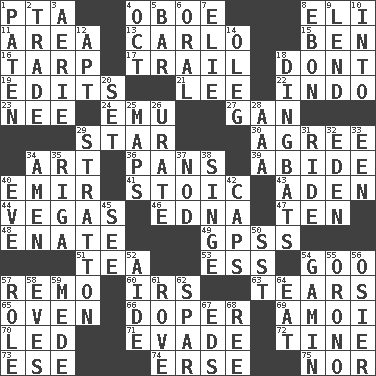ACROSS 1. Parent Teacher Association (abbr.) 4. Mitch Miller's instrument 8. Biblical high priest 11. Type of rug 13. Monte _, Las Vegas Hotel/Casino 15. Benjamin's nick name 16. Canvas cover 17. Go after with the intent to catch 18. Do not 19. Prepares for publication 21. Area sheltered from the wind 22. Southeast Asian peninsula 23. Born 24. Australian flightless bird 27. Separate the seeds from cotton 29. Play the lead 30. Match 34. Tate display 36. Baking dishes 39. Tolerate 40. Arab leader 41. Unemotional 43. Arabian gulf 44. Viva Las _ 46. Pulitzer Prize-winning author Ferber 47. "___ Little Indians" 48. Related on the mother's side 49. Global Positioning Systems (abbr.) 51. Afternoon social gathering 53. Double-curved letter 54. Thick or sticky substance 57. San ____ (Riviera town) 60. Big collection agency 63. Lacerates 65. Baking chamber 66. Drug addict 69. Mine, in Marseilles 70. Directed 71. Dodge 72. Prong on a fork 73. Compass dir. 74. Celtic language 75. Or not DOWN 1. Eucharist need 2. Buy and sell 3. Nest on high 4. Sep. follower 5. Long, evenly shaped piece 6. Of the mouth 7. Writer Wiesel 8. Inky black, to poets 9. Grant temporary use of 10. To the inside or interior of 12. Fitting 14. Cassini of fashion 18. Empty-headed or silly people 20. Put into a specified state 25. Atlas contents 26. A salt of uric acid 28. American Automobile Association (abbr.) 29. Ski resort town in Vermont 31. Travel on an animal 32. Paradise 33. Car or cant ending 34. So be it 35. Port city in Latvia 37. Allow head to fall sleepily 38. Burn superficially 40. First lady 42. Balmoral and tarboosh 45. Observe 50. Fast jet (abbr.) 52. Helper 54. Homeless child 55. U. of Maine site 56. Flexible twig of a willow tree 57. Hero or heavy, e.g. 58. Nights before holidays 59. Ancient Persian 61. Be footloose 62. Coast Guard woman 64. Ingest 67. Begley and Asner 68. Portuguese money of account (variant)