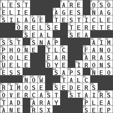 ACROSS 1. For fear that 5. "We ___ not amused" (Victoria) 8. Bear (Spanish) 11. Writer Wiesel 12. Grows older 13. Tired old horse 14. Fodder prepared in a silo 17. A testis 19. Threatening words 21. Cylindrical with tapered ends 22. Lick closed 23. Ocean 24. Fast jet (abbr.) 27. Fastener 29. Direct toward a target or goal 32. Give a jingle 34. Affectionate concern, for short 36. Papal veil 37. Hero or heavy, e.g. 38. Hearing organ 39. Ancient river in northeast Turkey 40. Ubangi River tributary 41. Color 42. Removes the wrinkles 43. Double-curved letter 44. Plant excrements 46. Modern: prefix 47. Immediately 50. Baby powder 52. Full of chinks, cracks, or crevices 55. Spring feasts 57. Cloudy 59. Flight of steps 62. Small boy 63. Like ___ of sunshine 64. Entreaty 65. One (Scot) 66. Acura sports coupe 67. Ooze DOWN 1. French article 2. Biblical high priest 3. Grain storage tower 4. Pulls into pieces 5. Mature 6. Musical pauses 7. First name in cosmetics 8. At one time in the past 9. Table seasoning 10. Double curve, resembling the letter S 12. Had dinner 15. Honkers 16. Enthusiasm 18. Retirement account (abbr.) 20. Scheduled 24. Upset 25. Imelda's hoard 26. For Whom the Bell _____ 28. Live dramatic performances 29. Composer Copland 30. Silly 31. With motion or animation 33. Born 35. Cause to be 36. At a great distance 42. Small island 45. Writing tablets 47. Or not 48. Witty Wilde 49. Puts on (as clothing) 51. Dice game 52. Roll call or roster of names 53. "Terrible" tsar 54. Ancient Persian 55. Filthy place 56. Drop; flow; fall 58. Saxophone 60. Portuguese money of account (variant) 61. Plant excrement