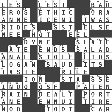 ACROSS 1. French article 4. For fear that 8. Long, evenly shaped piece 11. Greek god of love 13. Principle of right and wrong 15. Mouth or opening 16. Queen of England 1702-14 17. Ancient Celtic tribe of eastern Britain 18. It was, poetically 19. Amusement-park features 21. Fast jet (abbr.) 22. Otherwise 23. Born 24. Being at a high temperature 27. Snakelike fish 29. Unit of force 30. Chalkboard 34. Had dinner 36. Extremities 39. Vegetable dish 40. Of or related to the anus 41. Took without asking 43. Hats (slang) 44. Utah city north of Ogden 46. Saudi Arabian king (1953-1964) 47. It is 48. Clothes sense 49. Cause heat under the collar 51. Electrically charged atom 53. R.R. building 54. Compass dir. 57. Southeast Asian peninsula 60. Order of Saint Francis (abbr.) 63. Eucharist need 65. Precipitation 66. Started a card game 69. Left side of a ship or aircraft 70. A saturated hydrocarbon 71. World-weariness 72. Become fatigued 73. Dreamland 74. A blast of a horn 75. 4-wheeled motor vehicle DOWN 1. Memorize 2. Bert's buddy 3. Message 4. Flowery wreath 5. And so on (abbr.) 6. "______ My Girl" (Turtles hit) 7. Metal containers 8. Soup holder 9. Ancient river in northeast Turkey 10. Raze (variant) 12. Observe 14. Quote 18. Copy Pinocchio 20. Like a shrinking violet 25. Washington bills 26. Portable shelters 28. Curvy letter 29. Conveyance 31. Came down and settled, as after flight 32. Small amounts or degrees 33. Begley and Asner 34. Small Philippine buffalo 35. Labels 37. ___ good deed 38. Plays smoothly or legato 40. Keyboard modifier key 42. Prepare for publication 45. Modern: prefix 50. Pet locale 52. Thickened enlargement 54. Unemotional 55. Spanish missionary in California 56. Keyboard key 57. SW Asia republic 58. Billionth: prefix 59. Passed on 61. Transmitted 62. Papal veil 64. Fitting 67. Nilotic language 68. Teat (slang)
