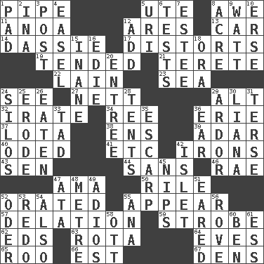 ACROSS 1. Corncob 5. Shoshoni 8. Deep reverence 11. Small Philippine buffalo 12. Ancient Greek god of war 13. 4-wheeled motor vehicle 14. Small ungulate mammals of Africa 17. What propaganda does 19. Watched over 21. Cylindrical with tapered ends 22. (Had) reclined 23. Ocean 24. Perceive with the eye 27. Remaining after all deductions 29. The first octave above the treble staff 32. Feeling or showing extreme anger 34. To separate or throw off 36. One of the Great Lakes 37. Globular water bottle used in Asia 38. Followers of ems 39. The sixth month of the Jewish calendar 40. Wrote a lyric poem 41. And so on (abbr.) 42. Metal shackles 43. Elected rep. 44. Without 46. Actress Charlotte 47. Nanny (var.) 50. Cause heat under the collar 52. Spoke pompously 55. Seem 57. Accusation by an informer 59. Disco prop 62. Begley and Asner 63. Roll call or roster of names 64. Nights before holidays 65. Friend of Pooh 66. Eastern Standard Time (abbr.) 67. Cub Scout units DOWN 1. Groovy apt. 2. _ tizzy (2 wds.) 3. Mail 4. Artist's stand 5. RI univ. 6. Trials 7. First name in cosmetics 8. 1/640 square mile 9. Electrical Unit 10. Celtic language 12. Find the sum of 15. Lacking in sense or substance 16. Singer Brickell 18. Mouth or opening 20. Main course 24. Grain storage towers 25. Wear away 26. Ingested 28. Portable shelters 29. Zeal 30. Woody, climbing, usually tropical plant 31. Laconic 33. Small boy 35. Fortification 36. Ewer handle 42. Small island 45. Cuts off 47. _ moment's notice (2 wds.) 48. Distance measurement (Brit.) 49. Goodbye (Sp.) 51. Having ears or earlike features 52. River in Europe 53. Do over again 54. In addition 55. Santa ___, CA 56. Be footloose 58. Baseball player Mel 60. Benjamin's nick name 61. Curvy letter