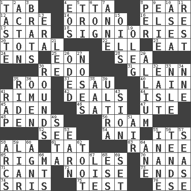 ACROSS 1. Keyboard key 4. Singer James 8. Lightbulb-shaped fruit 12. 1/640 square mile 14. U. of Maine site 16. Otherwise 17. Play the lead 18. Seigniories (variant) 20. "_____ Recall" 22. Pipe bend 23. Consume 24. Followers of ems 25. Period of immesurable duration 28. Ocean 30. Do over again 31. American astronaut and politician John 35. Friend of Pooh 37. Son of Isaac 40. (Had) reclined 41. Tall New Zealand timber tree 42. Allots cards 44. Capri or Wight 45. An important port of Yemen 46. Suttee (variant) 47. Shoshoni 48. Depends 50. Wander 52. Perceive with the eye 54. Black tropical American cuckoo 55. ___ a Wonderful Life 58. Wing 61. Make lace 63. Indian princess (variant) 65. Frustrating wastes of time 70. Grandmother 71. Patter 72. Annoying sound 73. Extremities 74. Indian titles of respect 75. Trial 76. Compass dir. DOWN 1. Clothes sense 2. 13-14th century defensive garment 3. Naughty children 4. Greek goddess of the dawn 5. Three (prefix) 6. Coat; cloak 7. Queen of England 1702-14 8. For each 9. Writer Wiesel 10. Toward the sea 11. State of inaction 13. Period 15. Lubricates 19. Cassini of fashion 21. Area sheltered from the wind 26. Wrote a lyric poem 27. Olfactory organs 29. Plant genus of onion and garlic 30. Periods in a boxing match 32. Compass direction 33. "Death on the ____" 34. Compass dir. 35. Travel on an animal 36. Sign of things to come 38. Auto club (abbr.) 39. Extremist 41. Reproach for some lapse or misdeed 43. The Jewish people; Israel 49. Bristle 51. Wind 53. Merit 55. Lacking in sense or substance 56. Watches over 57. Gospel singer Marvin 58. Curves 59. One who doesn't tell the truth 60. Hindu god of fire 62. A blast of a horn 64. A saturated hydrocarbon 66. Mountains (abbr.) 67. Untruth 68. Curvy letter 69. Arrange properly for use