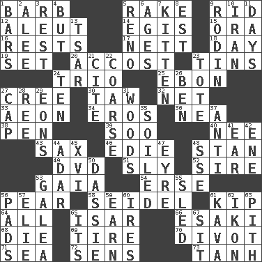ACROSS 1. Sharp remark 5. Immoral or dissolute person 9. To free from 12. Native American of Southwest Alaska 14. The front part of a cuirass 15. Mouth or opening 16. Musical pauses 17. Remaining after all deductions 18. 24 hours 19. Arrange properly for use 20. Buttonhole 23. Canisters 24. Musical group of three 25. Inky black, to poets 27. Algonquian 30. The 23rd letter of the Hebrew alphabet 32. Fish or hair follower 33. Period of immesurable duration 34. Greek god of love 36. Teachers' org. 38. Animal enclosure 39. "Barney Miller" actor Jack 40. Born 43. Saxophone 46. Singer Brickell 48. Comedian Laurel of Laurel & Hardy 49. Movie disc 51. Cunning 52. Beget 53. Greek goddess of the earth (variant) 54. Celtic language 56. Lightbulb-shaped fruit 58. Beer mug 61. Sleep 64. Everything 65. Austrian river, tributary to the Danube 66. 1973 Nobel Price Winner (Physics) Leo 68. Expire 69. Become fatigued 70. A piece of turf (Scot.) 71. Ocean 72. Elected reps. 73. Hyperbolic tangent DOWN 1. Soap units 2. Toward shelter 3. Remainder 4. With the exception that 5. Former U.S. Attorney General Janet 6. Ripens 7. Baby cat 8. Eastern Standard Time (abbr.) 9. "The Thinker" sculptor 10. SW Asia republic 11. 24-hour periods 13. Russian ruler of old 21. Quote 22. Rough 23. Carry 24. "___ Little Indians" 26. Benjamin's nick name 27. Head covering 28. To separate or throw off 29. Immeasurably long periods of time 31. Forest 35. Dirtied 37. Against 41. Ewer handle 42. Compass dir. 44. The sixth month of the Jewish calendar 45. 16 47. Jane of fiction 48. Compass dir. 50. Hyrax 53. An organ shaped like a helmet 55. Downhill vehicle 56. Writing tablets 57. Writer Wiesel 59. Merit 60. Angers 61. Polynesian shrub of the pepper family 62. Picture 63. Heart or essence 65. ___ a Wonderful Life 67. Be seated