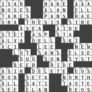 ACROSS 1. Austrian river, tributary to the Danube 5. Cause to be 9. Auto club (abbr.) 12. Olfactory organs 14. Actor Alda or Thicke 15. Pipe bend 16. Proceeds 17. Zero-star reviews 18. Actress Charlotte 19. Mouth or opening 20. College paper 23. The founder of a family 24. At sea 25. Assistant 27. Proofreading order 30. Cleo's killer 32. R.R. building 33. Inventor's middle name 34. Small valley 36. What Jean-Claude Killy likes to do 38. One more than ninety 39. Area sheltered from the wind 40. ___ Haven, CT 43. Car dealer's back yard 46. Without 48. Otherwise 49. Superhero pair 51. Boy, to dad 52. System (abbr.) 53. Fermented drink made from hops 54. Travel on or in a vehicle 56. SW Saudi Arabia district 58. Keyboard key 61. Greek goddess of the dawn 64. Director Reiner 65. Stalk of a moss capsule 66. Compass direction 68. 100% 69. Suttee (variant) 70. Clothes sense 71. Observe 72. Flair 73. Vintage cars DOWN 1. To the inside or interior of 2. Fly high 3. "____ silly question..." 4. To sift 5. Atlas contents 6. Jai ____ 7. Sunflower state 8. Followers of ems 9. Nest on high 10. Having or resembling wings 11. Toward shelter 13. Fast planes 21. Froth on beer 22. Artist's stands 23. Neighbor of Neb. 24. "One Day ___ Time" 26. It is 27. Saxophone 28. Affectionate concern, for short 29. Morally bad or wrong 31. Entreaties 35. Poe poem 37. In an inward manner 41. Double-curved letter 42. Soggy 44. River in Europe 45. Third day of the wk. 47. In a ____ (agitated or irritated) 48. Compass dir. 50. Severe or trying experience 53. God's Word 55. Incision 56. Caspian sea tributary 57. Flatfish 59. Singer James 60. (Had) reclined 61. Celtic language 62. Von Bismarck 63. "______ My Girl" (Turtles hit) 65. Compass dir. 67. Boat paddle