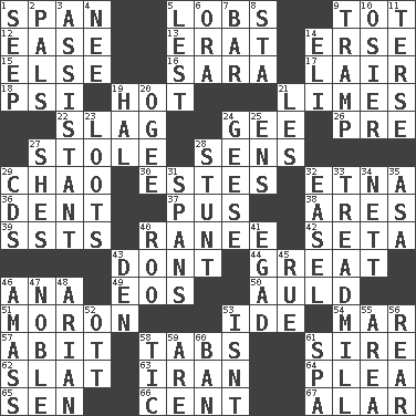 ACROSS 1. Connect, as a bridge 5. Tennis shots 9. Small child 12. Comfort 13. Part of Q.E.F. 14. Celtic language 15. Otherwise 16. "Two Mules for Sister ____" 17. Den 18. Air pressure measure (abbr.) 19. Being at a high temperature 21. Citrus fruits 22. Volcanic refuse 24. Turn to the right 26. Before (prefix) 27. Fur scarf 28. Elected reps. 29. US Secretary of Labor Elaine L. _ 30. _____ Park, CO 32. Inactive volcano in Sicily 36. Gouge 37. Ichor 38. Ancient Greek god of war 39. Fast planes 40. Indian princess (variant) 42. Stalk of a moss capsule 43. Do not 44. Relatively large 46. Santa ___, CA 49. Greek goddess of the dawn 50. Old (Scot.) 51. Person of subnormal intelligence 53. Binary compound 54. Spoil 57. "This won't hurt ____!" 58. Bar bills 61. Title for a man of rank and authority 62. Narrow board 63. SW Asia republic 64. Entreaty 65. Elected rep. 66. Penny 67. Having or resembling wings DOWN 1. Ooze 2. Friends 3. Helper 4. Born 5. For fear that 6. Mouth or opening 7. Drinking establishment 8. R.R. building 9. _____ steamer (cargo ship) 10. Flexible twig of a willow tree 11. Laconic 14. Biblical high priest 19. Actor Linden 20. Double curve, resembling the letter S 21. French article 23. Plunders 24. Honkers 25. Followers of ems 27. "______ My Girl" (Turtles hit) 28. Difficult or unusual or dangerous feat 29. Music discs 31. Connects, as a bridge 32. Artist's stand 33. Excercise machine 34. Remaining after all deductions 35. White ___ sheet 40. Friend of Pooh 41. Mild oath 43. Lair 45. Regret 46. Collect or gather 47. Impressive in appearance 48. Believer in; advocate of (suffix) 52. Baseball player Mel 53. Is not 55. Type of rug 56. Rump 58. Nervous spasm 59. "We ___ not amused" (Victoria) 60. Prohibit 61. Health resort