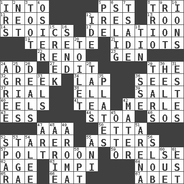 ACROSS 1. To the inside or interior of 5. Pacific Standard Time (abbr.) 8. Three (prefix) 11. Vintage cars 12. Angers 13. Friend of Pooh 14. Unemotional ones 17. Accusation by an informer 19. Cigar-shaped 21. Foolish or stupid persons 22. Former U.S. Attorney General Janet 23. Commissioned mil. rank 24. Say or write further 27. Prepare for publication 29. Definite Article 32. Of Greece 34. Pet locale 36. Observes 37. Monetary unit of Yemen 38. Pipe bend 39. Table seasoning 40. Snakelike fish 41. Afternoon social gathering 42. Haggard of country music 43. Double-curved letter 44. Portico 46. Mayday 47. Auto club (abbr.) 50. Singer James 52. A viewer who gazes fixedly 55. Michaelmas daisies 57. Coward 59. Threatening words 62. Personal question 63. Body of Kaffir warriors 64. Horse sense 65. Actress Charlotte 66. Ingest 67. Collude with DOWN 1. Big collection agency 2. Fish or hair follower 3. A blast of a horn 4. Flexible twig of a willow tree 5. Before (prefix) 6. Major League Baseball Commissioner Bud 7. Sadhe (variant) 8. Musical group of three 9. Carrot, for example 10. Charged particles 12. Binary compound 15. Small stream 16. Transmit 18. Shallow baking pan 20. Bathroom plumbing fixture 24. Match 25. Frees from moisture 26. Allots cards 28. Stories 29. Rends 30. Phone greeting 31. _____ Park, CO 33. Raised railways 35. Food holders 36. Compass dir. 42. Mother 45. Von Bismarck 47. Tate display 48. Nest on high 49. Odor 51. Sports stadium 52. Practice fight 53. Ancient Roman robe 54. Toward shelter 55. Cuckoo 56. Messy guy 58. Choose 60. Take to court 61. Eastern Standard Time (abbr.)