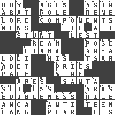 ACROSS 1. Male child 4. Ripens 8. SW Saudi Arabia district 12. Blind as ____ 14. Hero or heavy, e.g. 15. French philosopher Descartes 16. Old wives' tales, e.g. 17. Pieces 20. Not women's 21. Make a knot 22. Keyboard modifier key 23. Check the growth or development of 27. For fear that 29. 480, 500 or 516 sheets of paper 31. Introduce or present, as a question 34. Climbing, woody, usually tropical vines 35. Length times width 36. Farming town in central California 39. Part of HMS, perhaps 41. Russian ruler of old 42. Collude with 43. Frees from moisture 46. Light colored 47. Title for a man of rank and authority 48. Ancient Greek god of war 51. Before Barbara or Clara 54. Arrange properly for use 56. Curvy letter 58. Caspian sea tributary 61. The property of being fit to eat 66. Cause heat under the collar 67. Small Philippine buffalo 68. Against 69. Adolescent 70. Austrian-born American filmmaker Fritz 71. Lightbulb-shaped fruit 72. French article DOWN 1. Lip ointment 2. Mitch Miller's instrument 3. Entertaining tales 4. Curve 5. Thick or sticky substance 6. Shade tree 7. Back-to-school mo. 8. "We ___ not amused" (Victoria) 9. Legislators 10. International (abbr.) 11. Repose 13. Trial 18. Petroleum 19. Born 24. RI univ. 25. Teachers' org. 26. Hyperbolic tangent 28. Arguments over trivial matters 30. Unmarried girls 32. Ocean 33. Hearing organ 34. 61 cubic inches 36. Pet locale 37. Chief or king in Benin or Nigeria 38. Conveyance 40. Indian titles of respect 44. Retirement account (abbr.) 45. Car or cant ending 49. Snakelike fish 50. Compass dir. 52. Small pie 53. Satellite of Uranus 54. Lick closed 55. Pulitzer Prize-winning author Ferber 57. Fastener 59. Toward shelter 60. Elected reps. 62. Paper or plastic container 63. Compass dir. 64. R.R. building 65. Title for a knight