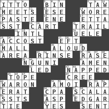ACROSS 1. "Tell ____ the Marines!" 5. Storage container 8. The 23rd letter of the Hebrew alphabet 11. Confronts 13. Compass dir. 14. Had on 15. Thick mixture 16. Compass dir. 17. Singer James 18. Fast jet (abbr.) 19. Draw slowly or heavily 21. Get behind 22. International (abbr.) 24. Ubangi River tributary 25. Buttonhole 27. Lizard (obsolete) 29. Shopping center 30. Verbally 32. Type of rug 33. Wash lightly 35. To erase 39. Group of southern Bantu languages 41. So be it 42. Directed 43. Slept 45. Drink excessively 48. Algonquian 49. Make _____ (do battle with) 50. Mine, in Marseilles 52. Hit sharply and swiftly 55. Part of Q.E.F. 56. Accounting whiz (abbr.) 57. Any of the three canals of the cochlea 59. Fast planes 60. Viper 61. _ Allan Poe 62. Standoff 63. Consenting reply 64. Transmitted DOWN 1. Naughty children 2. Afternoon social gatherings 3. A testis 4. Baseball player Mel 5. Fermented drink made from hops 6. Is not 7. Born 8. "_____ Recall" 9. Nick name for Arthur 10. Welt 12. Religious groups 14. Past tense of be (plural) 20. The first octave above the treble staff 21. Ballerina skirt 23. Pitcher Ryan 25. Nursemaid (var.) 26. Automobile 27. Raised railways 28. Enemy 30. Black tropical American cuckoo 31. Window treatment 33. Sorrow 34. Indiana (abbr.) 36. Electrical Measurement 37. Observe 38. Conclude 40. Small, secluded valley 43. Non-commissioned officer (abbr.) 44. Get up 45. Tarsus (plural) 46. Speak pompously 47. Cooking vessels 49. Compass direction 50. Domed church section 51. Atlas contents 53. Actor Alda or Thicke 54. Component 56. Island 58. Music discs