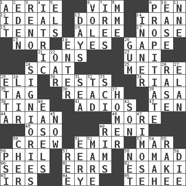 ACROSS 1. Nest on high 6. Zeal 9. Writing instrument 12. Perfect 13. Dormintory (informal) 14. SW Asia republic 15. Portable shelters 16. Toward shelter 17. Characteristic smell of wine 18. Not either 19. Snake ____ (dice throw) 20. Open wide 21. Charged atoms 23. Single; one (prefix) 24. Leave at once 25. Distance measurement (Brit.) 28. Connecticut Ivy Leaguer 30. Musical pauses 34. Monetary unit of Yemen 35. Label 36. Arrive at 38. White ___ sheet 39. Prong on a fork 41. Goodbye (Sp.) 43. Nine, plus one 44. Believer in; advocate of (suffix) 46. Greater amount 48. Bear (Spanish) 49. Painter Guido (1575-1642) 50. Group working together 51. Arab leader 53. Impair 56. Silvers or Donahue 57. 480, 500 or 516 sheets of paper 58. Roamer 60. Observes 61. Blunders 62. 1973 Nobel Price Winner (Physics) Leo 63. Big collection agency 64. Sight organ 65. Giggle DOWN 1. Small island 2. Genesis locale 3. Former U.S. Attorney General Janet 4. Of or pertaining to medicine 5. Raised railways 6. Grand slam 7. Angers 8. Madame (abbr.) 9. Appease 10. Relaxation 11. Compass dir. 13. 24-hour periods 14. More empty; more void 19. Keyboard key 20. Chewing product 22. Boat paddle 24. Seigniories (variant) 26. Raze (variant) 27. Liveliness 28. Singer James 29. Den 31. Ocean 32. Small amount or degree 33. _-fi 37. Homing pigeon 40. Artist's stands 42. Boy, to dad 45. At this time 47. Full of chinks, cracks, or crevices 49. Basketball hoops 50. "Mermaids" star 51. Suggestive of the supernatural 52. Female horse 54. Wet nurse 55. Immoral or dissolute person 56. Air pressure measure (abbr.) 57. Portuguese money of account (variant) 58. Fish or hair follower 59. Pass on