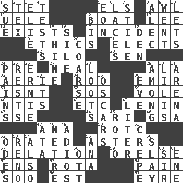 ACROSS 1. Proofreading order 5. Raised railways 8. Leather borer 11. Ubangi River tributary 12. Water vessel 13. Area sheltered from the wind 14. Is 17. Happening 19. Principles of right and wrong 21. Chooses 22. Grain storage tower 23. Elected rep. 24. Before (prefix) 27. Anneal 29. Insect wing 32. Nest on high 34. Friend of Pooh 36. Independent ruler or chieftain 37. Is not 38. Mayday 39. Short-tailed, large-bodied rat 40. Nuclear Threat Initiatives 41. And so on (abbr.) 42. Soviet premier 1918-24 43. Compass dir. 44. Indian skirt 46. Girls' org. (abbr.) 47. Nursemaid (var.) 50. College mil. group 52. Spoke pompously 55. Michaelmas daisies 57. Conveyance 59. Threatening words 62. Followers of ems 63. Round or rotation of duties 64. Ache 65. "Barney Miller" actor Jack 66. Eastern Standard Time (abbr.) 67. Jane of fiction DOWN 1. Institute legal proceedings 2. John Ritter's dad 3. Writer Wiesel 4. Trials 5. Period of immesurable duration 6. Shoestrings 7. Vertical member of a panel or frame 8. Actor Baldwin 9. Left 10. Allows 12. Altar cloth linen 15. One or ones belonging to thee 16. Drop; flow; fall 18. Lair 20. Unrefined 24. Aches 25. Musical pauses 26. Bert's buddy 28. Plunders 29. Amid 30. Ms. Damita and namesakes 31. Sports stadium 33. ___ a Wonderful Life 35. Motion picture awards 36. First lady 42. 61 cubic inches 45. Printing process, for short 47. _ moment's notice (2 wds.) 48. Distance measurement (Brit.) 49. Goodbye (Sp.) 51. Streamer paper 52. Lyric poems 53. Former U.S. Attorney General Janet 54. In addition 55. Santa ___, CA 56. Kill 58. Baseball player Mel 60. Title for a knight 61. Compass dir.