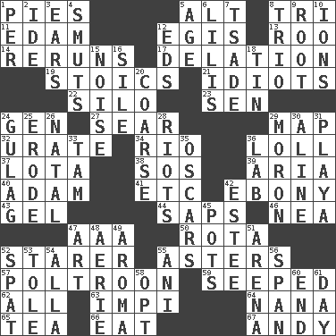 ACROSS 1. Sliced desserts 5. Keyboard modifier key 8. Three (prefix) 11. Dutch treat 12. Armor plate that protects the chest 13. Friend of Pooh 14. Summer TV shows 17. Accusation by an informer 19. Unemotional ones 21. Foolish or stupid persons 22. Grain storage tower 23. Elected rep. 24. Commissioned military rank (abbr.) 27. Burn superficially 29. Atlas unit 32. A salt of uric acid 34. River (Sp.) 36. Hang loosely or laxly 37. Globular water bottle used in Asia 38. Mayday 39. Operatic vocal solo 40. First of billions? 41. And so on (abbr.) 42. Dark wood 43. Set 44. Plant excrements 46. Teachers' org. 47. American Automobile Association (abbr.) 50. Roll call or roster of names 52. A viewer who gazes fixedly 55. Michaelmas daisies 57. Characterized by complete cowardliness 59. Oozed 62. 100% 63. Body of Kaffir warriors 64. Grandmother 65. Afternoon social gathering 66. Ingest 67. "60 Minutes" Commentator Rooney DOWN 1. For each 2. Binary compound 3. Hearing organs 4. Obscenities 5. Grow older 6. Ms. Damita and namesakes 7. Sadhe (variant) 8. Musical group of three 9. Carrot, for example 10. Charged particles 12. Begley and Asner 15. Annoying sound 16. Drop; flow; fall 18. Shallow baking pan 20. Rough 24. Russian prison camp 25. Wear away 26. Relating to or accompanying birth 28. Disturbances 29. Person of subnormal intelligence 30. Place in a line 31. Beach, in Buenos Aires 33. Scottish cap 35. Motion picture awards 36. Experiment locale 42. First name in cosmetics 45. Cooking vessels 47. Tate display 48. Nest on high 49. Scent 51. Sports stadium 52. Argument over a trivial matter 53. Lacquered or enameled metalware 54. Silent film actress Nazimova 55. Cuckoo 56. Connect, as a bridge 58. Choose 60. Conclusion 61. 24 hours