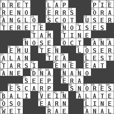 ACROSS 1. Cy Young winner Saberhagen 5. Pet locale 8. Sliced dessert 11. Western Nevada city 12. Blunders 14. Mouth or opening 15. White American of non-Hispanic descent 17. Highlander 18. One who makes use of a thing 19. Cylindrical with tapered ends 21. Annoying sounds 23. Scottish cap 25. Prong on a fork 26. Characteristic smell of wine 27. Sep. follower 28. Santa ___, CA 31. Australian flightless bird 33. Nine, plus one 35. Failure 37. Actor Alda or Thicke 38. Afternoon social gathering 40. For fear that 41. Tarsus (plural) 43. Compass dir. 45. Consume 46. One (Scot) 47. Heredity factor (abbr.) 50. Billionth: prefix 52. Ooze 53. Epoch 54. Fortification 56. Sounds asleep 61. Indonesian resort city 62. Distinctive style or manner 65. Having winglike extensions 66. Bear (Spanish) 67. Merit 68. Actor's bit 69. Dripping 70. Actress Charlotte 71. Of or related to the anus DOWN 1. Naughty child 2. French philosopher Descartes 3. Engineer (abbr.) 4. Lacquered or enameled metalware 5. French article 6. Curve 7. Right away 8. Airs 9. Angers 10. Hearing organ 13. Unemotional 16. "Beetle Bailey" pooch 18. Purpose 20. Compass direction 22. International (abbr.) 24. Rendezvous 26. Religious women 28. Toward the sea 29. A home for chicks 30. Tate display 31. Liveliness 32. Female horse 34. Born 36. Margarine 37. "One Day ___ Time" 39. Queen of England 1702-14 42. It may be bright or harebrained 44. Hearing organs 48. Boldness 49. Become visible 51. Grandmother 52. _-fi 54. Relaxation 55. Notch 57. Rounded earthenware pot or jar 58. Precipitation 59. Inactive volcano in Sicily 60. Sew up the eyelids of hawks and falcons 61. Ribbon knot 63. Retirement account (abbr.) 64. Compass dir.