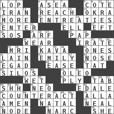 ACROSS 1. Trim (branches) 4. Toward the sea 8. ____ d'Azur (French Riviera) 12. SW Asia republic 14. Arrive at 16. Gumbo ingredient 17. Greater amount 18. Pleas 20. Keyboard key 22. Pipe bend 23. Lizard (obsolete) 24. Mayday 25. Sandy's bark 28. Infant food 30. Put on (as clothing) 31. Feeling or showing extreme anger 35. Medical imaging device (abbr.) 37. Polynesian shrub of the pepper family 40. Washington bills 41. (Had) reclined 42. Poet Dickinson 44. Sense of smell 45. Mild oath 46. Comfort 47. Make lace 48. Grain storage towers 50. Butter sub 52. Dripping 54. Travel a route regularly 55. Keyboard key 58. Quiet! 61. Modern: prefix 63. Peak District village in England 65. Act in opposition 70. Silent film actress Nazimova 71. So be it 72. Brizilian seaport 73. Anneal 74. Connecting point 75. Drug cop 76. A female animal or person DOWN 1. Citrus fruits 2. U. of Maine site 3. Pieces 4. "We ___ not amused" (Victoria) 5. Elected rep. 6. Erode 7. Land measure 8. Small bed 9. Migrant worker of the '30s 10. Not kosher 11. 90 degrees 13. Born 15. Aid 19. Jai ____ 21. Actress Charlotte 26. Immoral or dissolute person 27. Movie unit 29. Right away 30. Light entry point 32. Small Philippine buffalo 33. Trial 34. Compass dir. 35. Wise men 36. Monetary unit of Yemen 38. By way of 39. Columnist Joseph or Stewart 41. French article 43. Shout 49. Posted 51. Sight organ 53. Adolescent 55. Lies 56. Assad's deity 57. Memphis, Tenn. Street 58. Glance over 59. Like (prefix) 60. Became colored 62. Northwest Algerian city 64. Daniel's nick name 66. Compass dir. 67. _ moment's notice (2 wds.) 68. Auto 69. Affectionate concern, for short