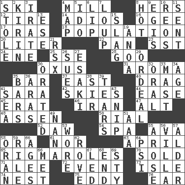 ACROSS 1. What Jean-Claude Killy likes to do 4. Place where flour is made 8. Possessive pronoun 12. Become fatigued 14. Goodbye (Sp.) 16. Double curve, resembling the letter S 17. Mouths or openings 18. Census information 20. 61 cubic inches 22. Baking dish 23. Fast jet (abbr.) 24. Compass dir. 25. Compass dir. 28. Thick or sticky substance 30. Amu Darya 31. Scent 35. Long, evenly shaped piece 37. Compass direction 40. To be drawn or hauled along 41. "Two Mules for Sister ____" 42. Atmospheres 44. Comfort 45. Part of Q.E.F. 46. SW Asia republic 47. The first octave above the treble staff 48. NE Netherlands city 50. Monetary unit of Yemen 52. Fool 54. Health resort 55. Actress Gardner 58. Mouth or opening 61. Or not 63. Showery time 65. Complicated, petty procedures 70. Disposed of to a purchaser 71. Toward shelter 72. Happening 73. Capri or Wight 74. Egg locale 75. Whirlpool 76. Hearing organ DOWN 1. Took without asking 2. Japanese brewing company 3. Feeling or showing extreme anger 4. Atlas unit 5. Wedding promise 6. Mouth edge 7. Central Nebraska county 8. Being at a high temperature 9. The front part of a cuirass 10. Vintage cars 11. Posted 13. Compass dir. 15. Volcanic refuse 19. Small Philippine buffalo 21. Acura sports coupe 26. Takes to court 27. 1973 Nobel Price Winner (Physics) Leo 29. Severe or trying experience 30. Declaimed 32. Taken by mouth 33. Vertical spar for supporting sails 34. Personal question 35. Taverns 36. Ancient river in northeast Turkey 38. Title for a knight 39. Pulls into pieces 41. Ocean 43. Sever or remove by pinching or nipping 49. Grandmother 51. American Automobile Association (abbr.) 53. Had on 55. Came up 56. Country estate 57. Tree or shrub in the Birch family 58. Northwest Algerian city 59. Cause heat under the collar 60. Eons 62. Be footloose 64. 23rd letter of the Greek alphabet 66. Was introduced to 67. Directed 68. Conclusion 69. Filthy place