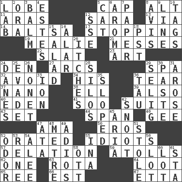 ACROSS 1. Ear part 5. Head covering 8. Keyboard modifier key 11. Ancient river in northeast Turkey 12. "Two Mules for Sister ____" 13. By way of 14. Greek mezzo-soprano Agnes 17. Ceasing 19. Ear of corn 21. Makes clutter 22. Narrow board 23. Tate display 24. Lair 27. Curves 29. Health resort 32. Keep away from 34. Part of HMS, perhaps 36. Rend 37. Billionth: prefix 38. Pipe bend 39. In addition 40. Paradise 41. "Barney Miller" actor Jack 42. Sets or collections 43. Arrange properly for use 44. Connect, as a bridge 46. Turn to the right 47. Nursemaid (var.) 50. Greek god of love 52. Declaimed 55. Foolish or stupid persons 57. Conveyance 59. Ringlike coral islands and reefs 62. Single 63. Roll call or roster of names 64. Plunder 65. To sift 66. Eastern Standard Time (abbr.) 67. Singer James DOWN 1. Experiment locale 2. Mouth or opening 3. Lip ointment 4. _____ Park, CO 5. Domesticated feline 6. Odor 7. Some stationery 8. Deliberation 9. Actor's bit 10. Labels 12. Compass dir. 15. First course 16. Having or resembling wings 18. Pacific Standard Time (abbr.) 20. Strong, restless desires 24. Natives or inhabitants of Denmark 25. Dodge 26. Music written for nine 28. Grain storage towers 29. Former Milwaukee Brewers owner Bud 30. Thick mixture 31. Came up 33. Electrically charged atom 35. Had an oblique or slanted direction 36. The 19th letter of the Greek alphabet 42. Snout, nose 45. Operatic vocal solo 47. "One Day ___ Time" 48. Distance measurement (Brit.) 49. Goodbye (Sp.) 51. Took without asking 52. Aroma 53. French philosopher Descartes 54. Toward shelter 55. _ tizzy (2 wds.) 56. Notch 58. Baseball player Mel 60. Car dealer's back yard 61. R.R. building