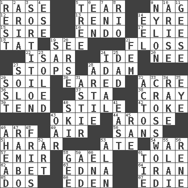 ACROSS 1. To erase 5. Pull apart 9. Tired old horse 12. Greek god of love 13. Painter Guido (1575-1642) 14. Jane of fiction 15. Title for a man of rank and authority 16. Inside; within (prefix) 17. Writer Wiesel 18. Make lace 19. Perceive with the eye 21. Soft thread for cleaning between teeth 22. Austrian river, tributary to the Danube 24. Binary compound 26. Born 27. Closes up, plugs up 28. First man 29. The visible part of the earth's surface 30. Having ears or earlike features 32. Measure of real estate 36. _ gin 37. R.R. building 38. Supercomputer manufacturer 39. Watch over 40. Vertical member of a panel or frame 42. Casino tip 43. Migrant worker of the '30s 44. Came up 46. Sandy's bark 49. Atmosphere 50. Without 51. Ethiopian city, capital of Harari 53. Had dinner 54. Armed conflict 57. Arab leader 58. Highlander 61. Lacquered or enameled metalware 62. Collude with 63. Pulitzer Prize-winning author Ferber 64. SW Asia republic 65. Two (Sp.) 66. Paradise 67. Singer Brickell DOWN 1. Respite 2. Roberta Peters solo 3. Conclusion 4. Compass dir. 5. Woody plant 6. Car or cant ending 7. Plus 8. River (Sp.) 9. High-strength synthetic material 10. Get up 11. Honkers 14. Snakelike fish 19. Plant excrement 20. Celtic language 21. Opposite of masc. 23. Having a sole or soles 24. Standard of perfection 25. June honoree 27. Flatfish 28. Nick name for Arthur 29. Fast jet (abbr.) 31. Being in motion 32. Gambison 33. What you're doing now 34. Libertine 35. Sight organ 40. What Jean-Claude Killy likes to do 41. 90 degrees 43. Boat paddle 45. Actress Charlotte 46. Having the leading position 47. Role for Stallone 48. Strips of potato fried in deep fat 52. Tate display 53. ____ Jay Lerner 55. Mountain range southwest of Kyrgyzstan 56. French philosopher Descartes 58. Unit of force equal to gravity 59. Say or write further 60. Compass dir. 61. Standoff