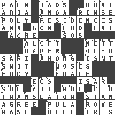 ACROSS 1. Inside of hand 5. Small amounts or degrees 9. Water vessel 13. Operatic vocal solo 14. Small Philippine buffalo 15. Remove soap 16. More than one (prefix) 17. Dwellings 19. Wet nurse (var.) 20. Arrow shooter 21. Nilotic language 22. Ingest 23. 43,560 square feet 25. Distress signal 26. At or to great height 30. Remaining after all deductions 34. More valued for its uncommonness 35. Butter sub 36. Indian skirt 39. Amid 42. Is not 43. In a ____ (agitated or irritated) 44. Olfactory organs 46. Whirlpool 47. Peak District village in England 48. Greek goddess of the dawn 51. Austrian river, tributary to the Danube 54. Take to court 57. Small island 58. Sorrow 60. Corporate head (abbr.) 62. Interpreter 65. Comedian Laurel of Laurel & Hardy 66. Match 67. Monetary unit of Botswana 68. Be footloose 69. Raze (variant) 70. Person who is morally reprehensible 71. Angers DOWN 1. Dad 2. Odor 3. Pale purple color 4. Fifth month 5. Edible starchy tuberous root 6. Afresh 7. Two (Sp.) 8. Moves on water 9. Storage container 10. Single time 11. Toward the sea 12. Trial 15. Vintage cars 18. Superhero pair 20. Actor Lugosi 24. Noteworthy scarcity 27. Mouth or opening 28. Opposite of masc. 29. Marketplace scale 30. Annoying sounds 31. Raised railways 32. "___ Little Indians" 33. Small child 36. Compass dir. 37. Also 38. To free from 40. Dreamland 41. Girls' org. (abbr.) 45. Writer Wiesel 48. Relaxation 49. Petroleum 50. Staphylococcus 52. Thespian 53. Break or tear apart 54. Play the lead 55. Capital and largest city of Mongolia 56. Hearing organs 58. Hero or heavy, e.g. 59. Mountain range 61. Washington bills 63. Born 64. Third day of the wk. 65. Indian title of respect (Mr.)