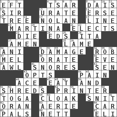 ACROSS 1. Newt 4. Russian ruler of old 8. Raised platform 12. Title for a knight 13. A salt of uric acid 14. Celtic language 15. Family _ (genealogy) 17. Pitcher Ryan 18. Actor's bit 19. Chrissie's court nemesis 21. Opts 23. Pass on 24. Begley and Asner 26. Call ___ day 27. So be it 28. Unable to walk 30. Cuckoo 31. Break 34. Director Reiner 37. Cartoonist voice _ Blanc 38. Declaim 39. First lady 40. Leather borer 41. Sounds asleep 42. Elected rep. 43. Chooses 44. Ache 46. Adept person 47. Erode 50. Added to 51. Fragments 54. Hard copy producer 57. Ancient Roman robe 58. Anything that covers or conceals 60. In a ____ (agitated or irritated) 62. NW Algerian seaport 63. Nest on high 64. Auto 65. Friends 66. Remaining after all deductions 67. Connecticut Ivy Leaguer DOWN 1. Eastern Standard Time (abbr.) 2. Securely fixed in place 3. Excercise machine 4. Marketplace scale 5. First course 6. _ moment's notice (2 wds.) 7. French philosopher Descartes 8. Keyboard key 9. N. Chile seaport 10. Is not 11. Perceives with the eye 13. Corn or form start 16. One of the Great Lakes 20. Nine, plus one 22. Welles in "The Third Man" 25. Schedule 27. Afresh 29. Eons 30. Wet nurse (var.) 31. Do not 32. Came up 33. Make imperfect 34. Home 35. Baking chamber 36. Benjamin's nick name 41. Broke a traffic law 43. Seas 44. Baking dish 45. Pismires 46. Therefore, facetiously 48. To the left, to Queeg 49. Distinguishing feature 51. Discontinue 52. Israeli folk dance 53. Glance over 55. Mamie's husband 56. Monetary unit of Yemen 59. Area sheltered from the wind 61. Three (prefix)
