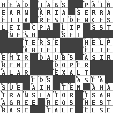 ACROSS 1. Froth on beer 5. Bar bills 9. Ache 13. Merit 14. Operatic vocal solo 15. Father Junipero _ 16. Singer James 17. Dwellings 19. Luau accessory 20. Accounting whiz (abbr.) 21. Mouth edge 22. Fast jet (abbr.) 23. Tender 25. Put into a specified state 26. Laconic 30. Assist 34. Satellite of Uranus 35. Writer Wiesel 36. Arab leader 39. Applies to a surface 42. SW Saudi Arabia district 43. French philosopher Descartes 44. Drug addict 46. Having or resembling wings 47. Glorify 48. Greek goddess of the dawn 51. At sea 54. Institute legal proceedings 57. Direct toward a target or goal 58. "___ Little Indians" 60. Nursemaid (var.) 62. Interpreter 65. Russian ruler of old 66. Match 67. Vintage cars 68. Behest 69. To erase 70. Story 71. Otherwise DOWN 1. Person who is morally reprehensible 2. Consumed 3. Nick name for Arthur 4. Heredity factor (abbr.) 5. Canvas cover 6. Type of rug 7. Altar cloth linen 8. Moves on water 9. Writing instrument 10. Arches 11. Angers 12. Political cartoonist Thomas 15. Back-to-school mo. 18. Pass on 20. "Mermaids" star 24. A viewer who gazes fixedly 27. To free from 28. Ocean 29. Dodge 30. Centers of feelings and intuitions 31. Raised railways 32. Cards in a Roman deck? 33. For each 36. Period 37. Cartoonist voice _ Blanc 38. _ tizzy (2 wds.) 40. Gift holder 41. Health resort 45. Liveliness 48. Relaxation 49. Lubricate 50. Don Adams' spy role 52. Artist's stand 53. Collect or gather 54. Play the lead 55. Capital and largest city of Mongolia 56. Hearing organs 58. Instrument 59. Celtic language 61. Johnson of "Laugh-In" 63. Born 64. Beverage made from leaves 65. Definite Article