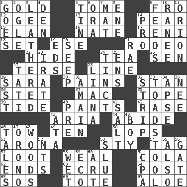 ACROSS 1. Gilded 5. Heavy book 9. Back 12. Double curve, resembling the letter S 13. SW Asia republic 14. Lightbulb-shaped fruit 15. Enthusiasm 16. Nathan's nickname 17. Painter Guido (1575-1642) 18. Arrange properly for use 19. Compass dir. 21. Cowboy competition 22. Flintstone garb 24. Beverage made from leaves 26. Elected rep. 27. Laconic 28. Actor's bit 29. "Two Mules for Sister ____" 30. Aches 32. Comedian Laurel of Laurel & Hardy 36. Proofreading order 37. Apple computer (short form) 38. Drink excessively 39. Periodic rise and fall of the sea level 40. Leg coverings 42. To erase 43. Roberta Peters solo 44. Stay 46. Pull behind 49. "___ Little Indians" 50. Chops off 51. Odor 53. Filthy place 54. Label 57. Plunder 58. Welt 61. Root beer relative 62. Conclusions 63. Shade of tan 64. Mail 65. Distress signal 66. Lug 67. Medicinal plant DOWN 1. Moves 2. Stare 3. Resembling or made to resemble leather 4. Lair 5. Prong on a fork 6. Mouth or opening 7. Floor protector 8. Compass dir. 9. Gives food to 10. Indian princess (variant) 11. Constellation of myth 14. Adept person 19. Begley and Asner 20. Ooze 21. Actress Charlotte 23. Feeling or showing extreme anger 24. A color or tint 25. Followers of ems 27. Jacques of French films 28. Climbing, woody, usually tropical vines 29. Fast jet (abbr.) 31. With great haste 32. Remove all contents or possession from 33. Inedible or poisonous agaric 34. Domed church section 35. Born 40. Before (prefix) 41. Table seasoning 43. _ moment's notice (2 wds.) 45. Male child 46. Lies 47. U. of Maine site 48. Forest 52. Mountains (abbr.) 53. Turn sharply 55. In addition 56. Yard entry 58. Soggy 59. Environmental prefix 60. Tate display 61. Tax preparer (abbr.)