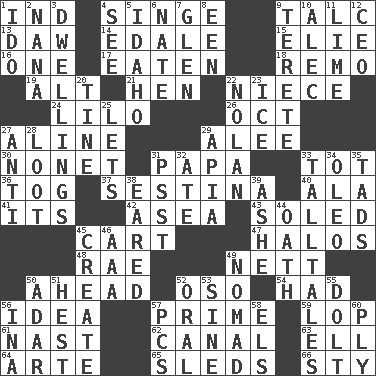 ACROSS 1. Working for oneself (abbr.) 4. Burn superficially 9. Baby powder 13. Simpleton 14. Peak District village in England 15. Writer Wiesel 16. Single 17. Ingested 18. San ____ (Riviera town) 19. The first octave above the treble staff 21. Layer 22. Sibling's daughter 24. _ and Stitch 26. Sep. follower 27. Place in a line 29. Toward shelter 30. Music written for nine 31. Dad 33. Small child 36. Coat; cloak 37. French poetic form 40. Chicken ___ king 41. It is 42. Toward the sea 43. Having a sole or soles 45. Haul 47. Auras 48. Actress Charlotte 49. Remaining after all deductions 50. At or in the front 52. Bear (Spanish) 54. Possessed 56. The content of cognition 57. A-one 59. Chop off 61. Political cartoonist Thomas 62. Lessep's creation 63. Pipe bend 64. Johnson of "Laugh-In" 65. Bobsleighs 66. Filthy place DOWN 1. Wedding promise 2. Nanny 3. Homes 4. Perceive with the eye 5. Potato state 6. Nathan's nickname 7. Small, secluded valley 8. Car or cant ending 9. Cylindrical with tapered ends 10. Actor Baldwin 11. Welles in "The Third Man" 12. Corporate head (abbr.) 20. Prong on a fork 22. Pitcher Ryan 23. Frozen water 25. Allows 27. Against 28. Plunder 29. Capital of Western Samoa 31. Inconspicuous attention getter 32. Had dinner 33. Baron Munchausen's specialties 34. Margarine 35. Small amounts or degrees 38. Having ears or earlike features 39. American tennis player Robert 44. Pledge 45. Make 46. Auto club (abbr.) 49. Wanderer 50. The sixth month of the Jewish calendar 51. Command 52. Of the mouth 53. Trig term 55. Dunce 56. _ tizzy (2 wds.) 57. Personal Computers (abbr.) 58. Raised railways 60. Strand of rope, yarn or thread