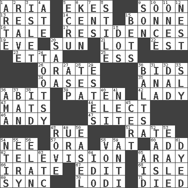 ACROSS 1. Operatic vocal solo 5. Supplements with great effort 9. Within a short period 13. State of inaction 14. Penny 15. Child's nurse 16. Lie 17. Dwellings 19. Night before a holiday 20. Player for Phoenix 21. Car dealer's back yard 22. Eastern Standard Time (abbr.) 23. Singer James 25. Curvy letter 26. Speak pompously 30. Auction offers 34. Fertile tracts in a desert 35. Of or related to the anus 36. "This won't hurt ____!" 39. Eucharist need 42. Kenny Rogers chart-topper in '80 43. Floor protectors 44. Choose 46. "60 Minutes" Commentator Rooney 47. Settings 48. Regret 51. Pace 54. Born 57. Mouth or opening 58. Large container 60. Increase 62. Boob tube 65. Like ___ of sunshine 66. Feeling or showing extreme anger 67. Prepare for publication 68. Capri or Wight 69. Synchronize (abbr.) 70. Farming town in central California 71. Passed on DOWN 1. Johnson of "Laugh-In" 2. Rob, plunder, or pillage 3. Small island 4. Had dinner 5. Shade of tan 6. Peachy ____! 7. Followers of ems 8. Vertical member of a panel or frame 9. Male offspring 10. At one time in the past 11. Washington bills 12. Egg locale 15. Wagers 18. Two (Sp.) 20. "Two Mules for Sister ____" 24. A girl or young woman (variant) 27. Viper 28. Beverage made from leaves 29. _____ Park, CO 30. Greek mezzo-soprano Agnes 31. _ tizzy (2 wds.) 32. Male parent 33. Mischievous 36. Housemaid (var.) 37. Forbid 38. It would 40. Biblical high priest 41. Fish or hair follower 45. Sure thing 48. Be footloose 49. RI univ. 50. Artist's stand 52. Tarsus (plural) 53. Peak District village in England 54. Nuclear Threat Initiatives 55. Suggestive of the supernatural 56. Liveliness 58. Empty area or space 59. Against 61. Colored 63. And so on (abbr.) 64. Wedding promise 65. Help