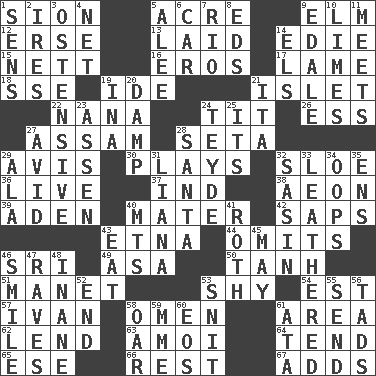 ACROSS 1. The Jewish people; Israel 5. Measure of real estate 9. Shade tree 12. Celtic language 13. Put down 14. Singer Brickell 15. Remaining after all deductions 16. Greek god of love 17. Unable to walk 18. Compass dir. 19. Binary compound 21. Small island 22. Grandmother 24. Teat (slang) 26. Double-curved letter 27. Indian state 28. Stalk of a moss capsule 29. Deliberation 30. Romps 32. _ gin 36. Not recorded 37. Indiana (abbr.) 38. Period of immesurable duration 39. Arabian gulf 40. Mother 42. Plant excrements 43. Inactive volcano in Sicily 44. Leaves out 46. _ Lanka 49. White ___ sheet 50. Hyperbolic tangent 51. French painter Edouard 53. Like a shrinking violet 54. Eastern Standard Time (abbr.) 57. _ the terrible 58. Sign of something about to happen 61. Length times width 62. Grant temporary use of 63. Mine, in Marseilles 64. Be inclined (to) 65. Compass dir. 66. Respite 67. Sums up DOWN 1. Elected reps. 2. Angers 3. Clearly or manifestly demonstrative 4. Fish or hair follower 5. Toward shelter 6. Auto 7. _ de Janeiro 8. Begley and Asner 9. Peak District village in England 10. Citrus fruits 11. Confronts 14. Raised railways 19. _ tizzy (2 wds.) 20. Moist 21. Call ___ day 23. NE Netherlands city 24. Miss Universe 1986, Barbara Palacios _ 25. It is 27. Enthusiastic 28. Before Barbara or Clara 29. Wing 31. Woody, climbing, usually tropical plant 32. Indian antelope 33. Tough but pliablecoriaceous 34. I made a mistake 35. Followers of ems 40. Mountains (abbr.) 41. Writer of Portnoy's Complaint (1969) 43. Consume 45. Fifth month 46. Grin 47. All-night dance parties 48. Lacking in sense or substance 52. Conclude 53. In a ____ (agitated or irritated) 55. Transmit 56. Small amounts or degrees 58. Rowing implement 59. Madame (abbr.) 60. Greek goddess of the dawn 61. _ moment's notice (2 wds.)